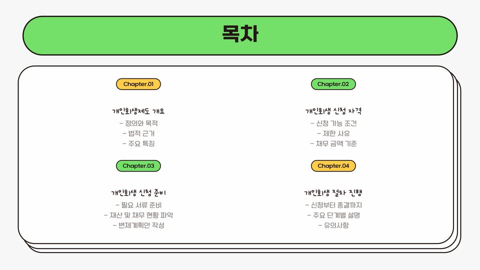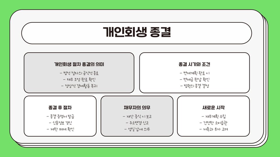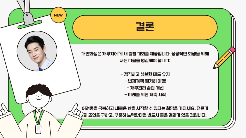 개인회생 절차는 복잡해 보일 수 있지만, 잘 알고 준비한다면 부채 문제를 해결할 수 있는 강력한 수단이 됩니다. 중요한 것은 법적 절차를 제대로 이해하고, 체계적으로 진행하는 것입니다. 신청서 작성부터 법원 심리, 상환 계획 수립까지 하나하나 철저히 준비하세요. 여러분이 경제적으로 새로운 출발을 하는 데 이 글이 도움이 되기를 바랍니다.