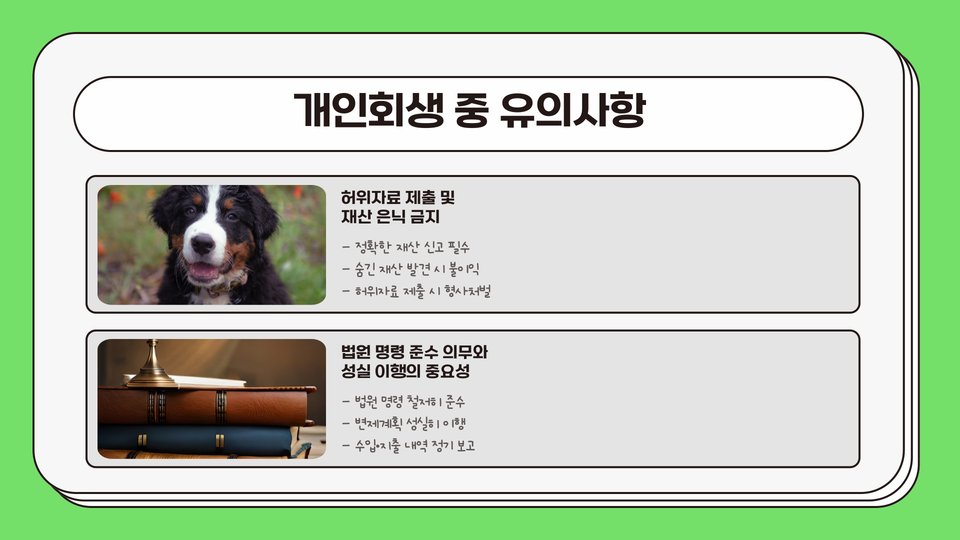 ☞ 중요 사항: 개인회생 절차 중에는 법원의 지침을 꼭 따르세요! 모든 서류 제출과 상환 계획을 정확히 지키는 것이 성공의 열쇠입니다.