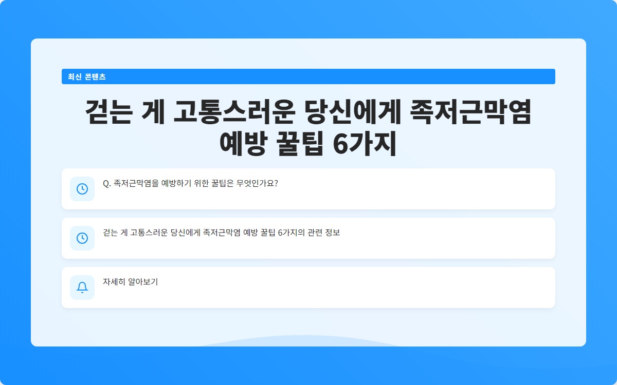 족저근막염은 발바닥의 통증을 유발하는 흔한 질환입니다. 많은 사람들이 이를 간과하지만, 이 질환은 일상 생활에 큰 영향을 미칠 수 있습니다. 걷고, 서고, 심지어 앉아 있을 때도 통증이 느껴질 수 있습니다. 이 글에서는 족저근막염을 예방하기 위한 6가지 유용한 팁을 소개합니다. 이 팁들을 통해 당신의 발 건강을 지키고, 더 자유롭게 움직일 수 있는 방법을 배워보세요.