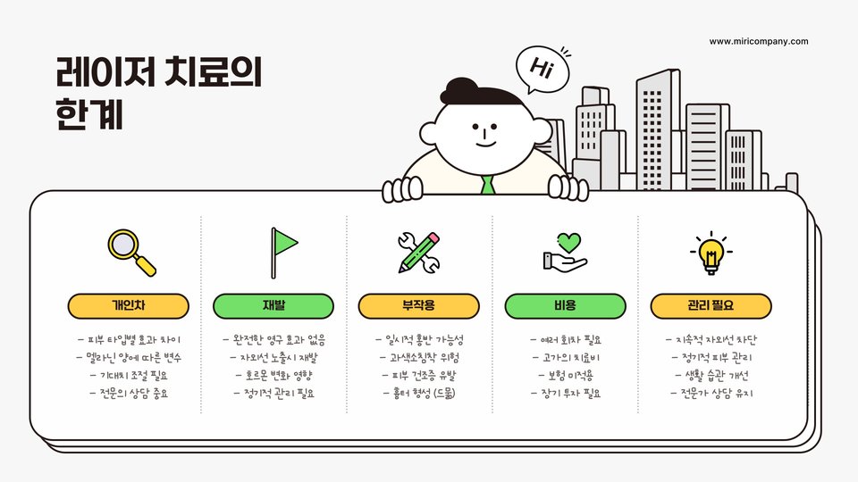 그러나 레이저 치료가 모든 사람에게 동일한 결과를 가져오지는 않기 때문에, 절대적인 기대보다는 한 번의 치료로 모든 것이 해결되지 않을 수 있다는 점을 고려해야 합니다. 지속적인 관리와 예방이 필요하며, 적절한 사용 후 관리법 또한 중요합니다.