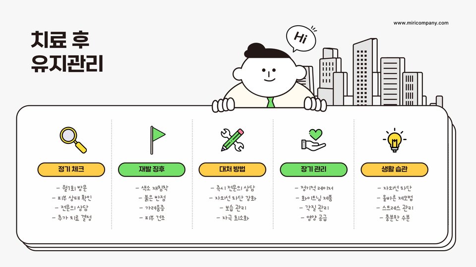 레이저 치료 후에는 자외선 차단제를 규칙적으로 사용하는 것이 필수입니다. 피부를 두껍게 관리하는 것도 중요하며, 대중목욕탕이나 수영장은 피해주는 것이 좋습니다.
