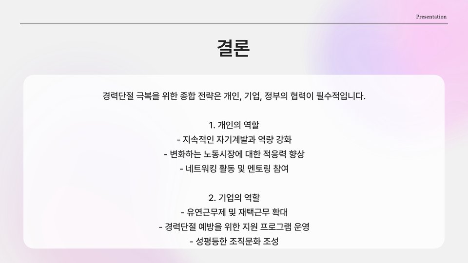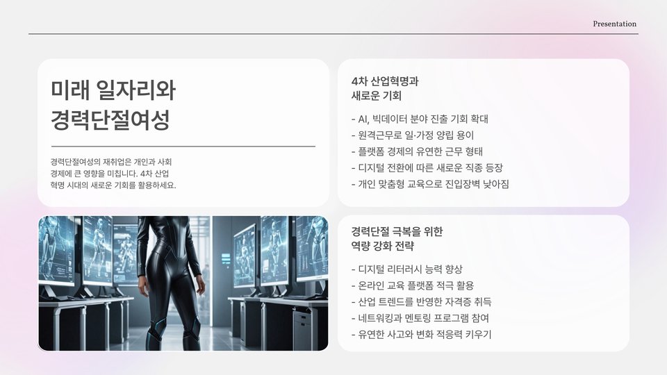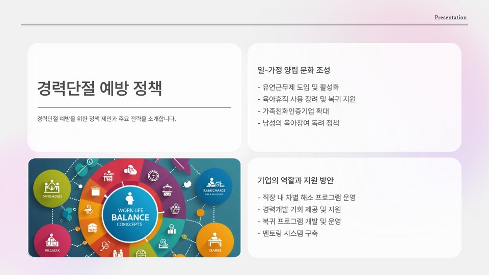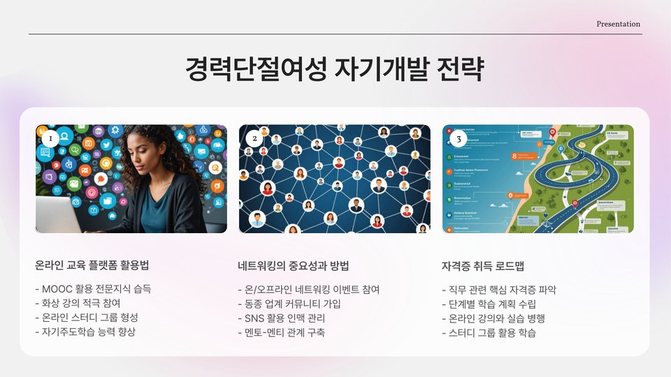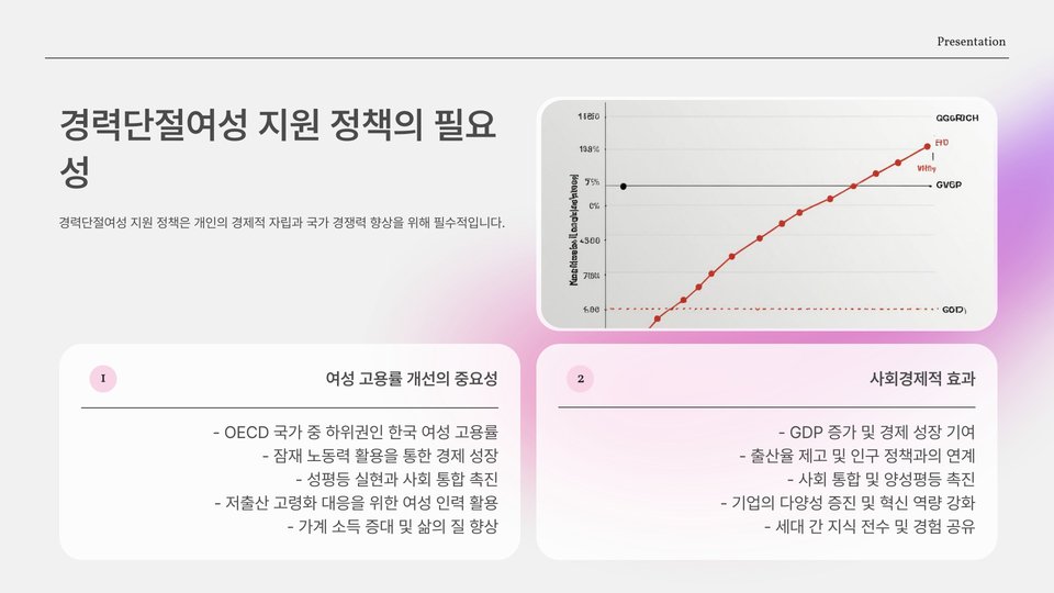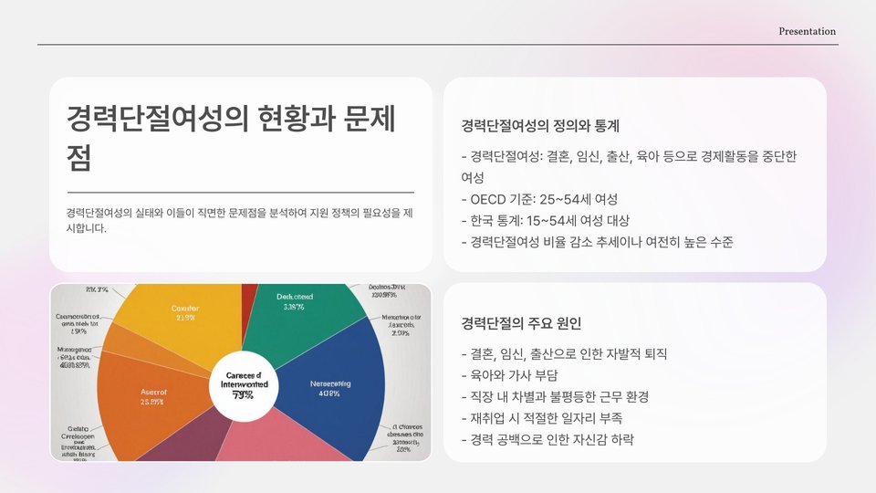 경력단절여성이란 결혼, 출산, 육아 등의 이유로 일정 기간 동안 직업 활동을 하지 못한 여성을 말합니다. 이러한 경력단절은 여성의 경제활동 참여율을 낮추고, 나아가 가족의 경제적 안정성에도 부정적인 영향을 미칩니다. 이러한 문제를 해결하기 위해 정부와 민간 부문에서는 다양한 지원 프로그램을 운영하고 있습니다. 예를 들어, 직업 교육, 재취업 지원금, 육아휴직 보장 등이 있습니다.
