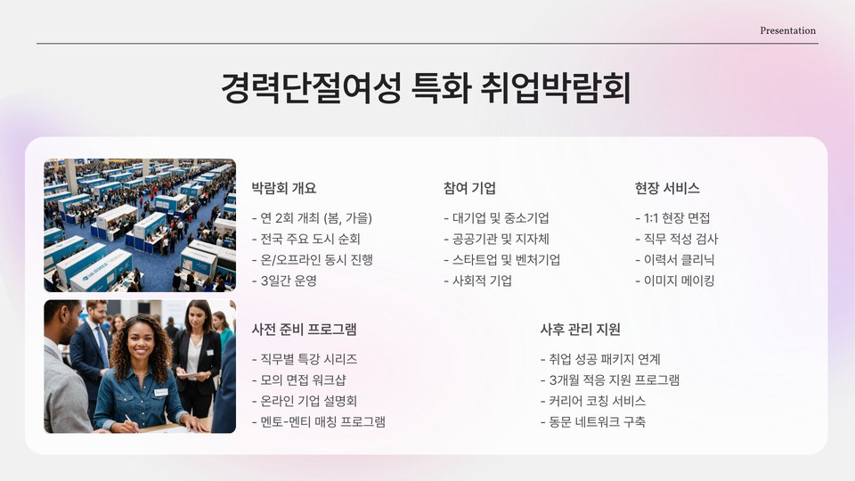 - 1. 경력단절여성 재취업 지원금: 직업 교육 및 취업 알선 서비스 제공.