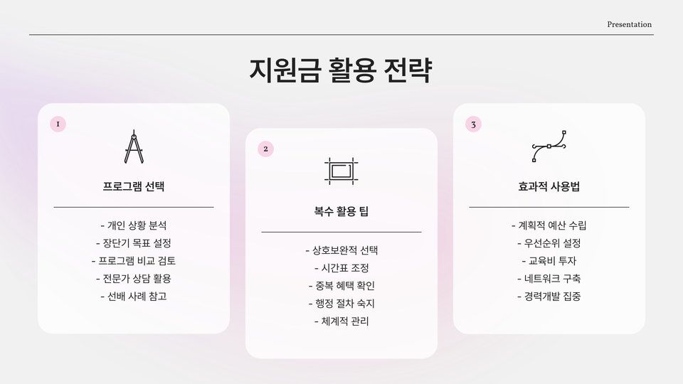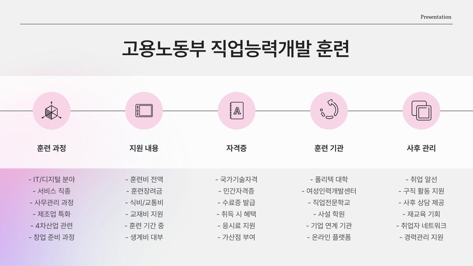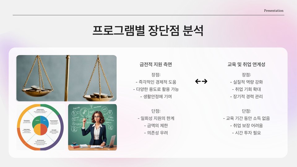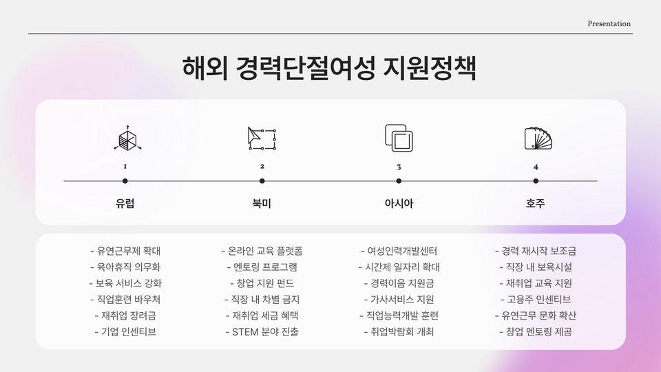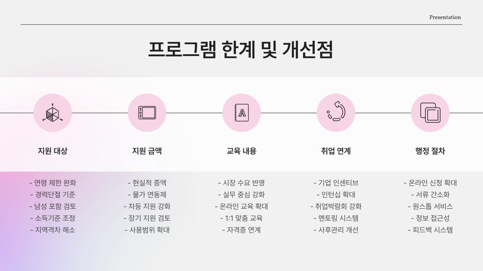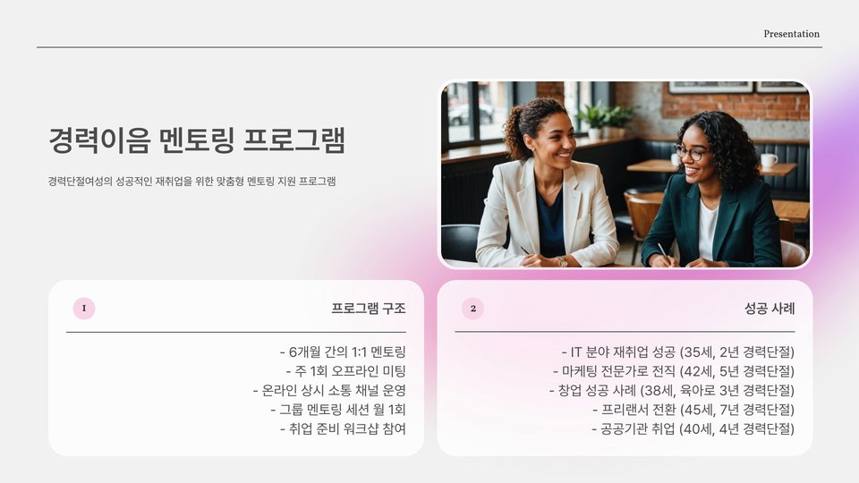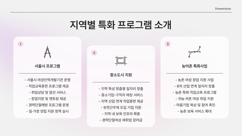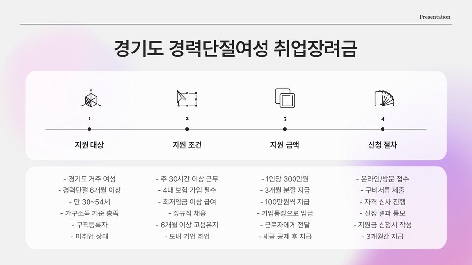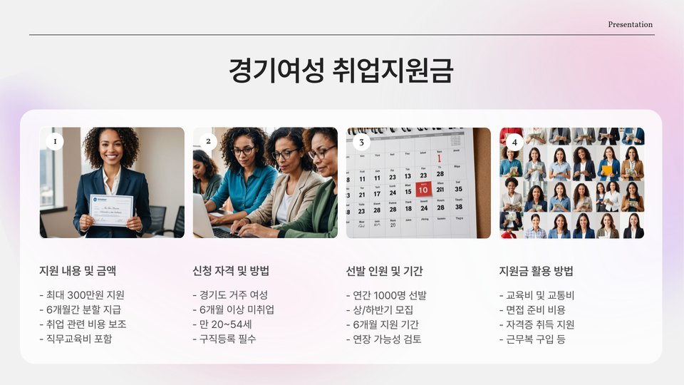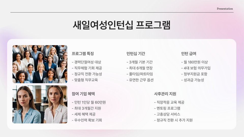 - 2. 여성 인턴십 지원금: 인턴십 기간 동안의 임금 지원.