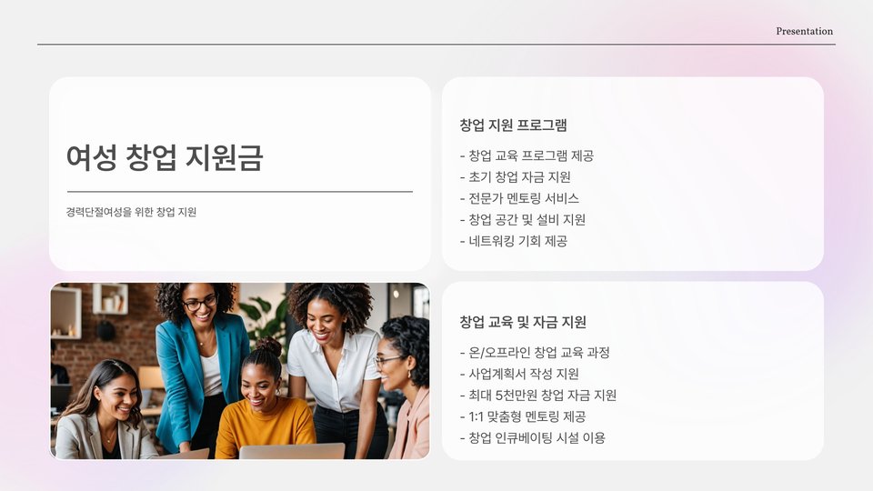 - 5. 여성 창업 지원금: 창업을 위한 초기 자금 지원.