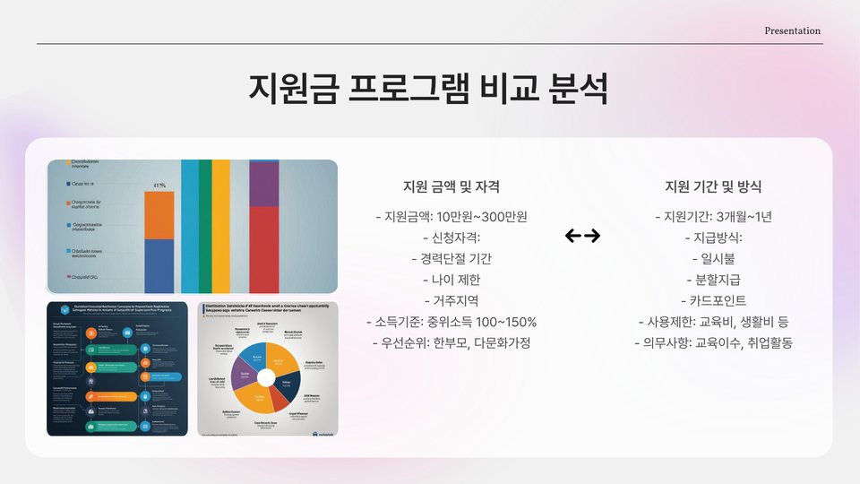 경력단절여성을 위한 지원금은 다음과 같이 크게 나뉘어집니다. 이들 중에서 가장 인기 있는 지원금으로는 직업훈련비 지원, 재취업 지원금, 그리고 여성가장 지원금이 있습니다. 아래는 이 지원금들에 대한 자세한 비교 및 분석입니다.