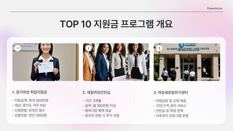 다음으로 경력단절여성을 위한 TOP 10 지원금을 소개합니다. 각 지원금의 특징과 혜택을 간단하게 정리해 보겠습니다.
