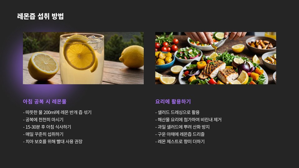 레몬즙은 다양한 방법으로 활용될 수 있습니다. 가장 간단한 방법은 물에 레몬즙을 몇 방울 떨어뜨려 마시는 것입니다. 아침에 공복에 마시면 몸의 수분을 보충하고, 대사 활성화에 도움을 줍니다. 또한, 레몬즙을 샐러드 드레싱에 추가하면 맛을 높이고, 영양가를 더할 수 있습니다.