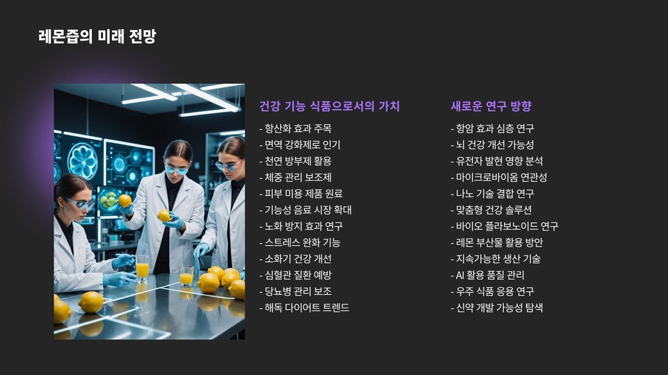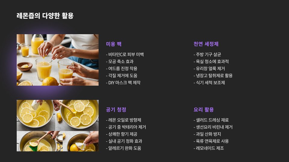 레몬즙은 단순한 음료가 아니라 우리 생활의 다양한 방면에서 활용할 수 있는 다재다능한 식품입니다. 그 효능을 잘 활용하면 건강과 미용 모두를 챙길 수 있는 기회를 제공받게 될 것입니다. 앞으로 레몬즙을 통해 건강한 생활을 이어가시기 바랍니다.