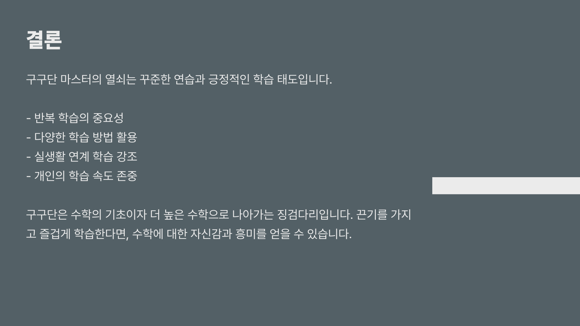 구구단은 수학의 기본적인 개념입니다. 이를 통해 학생들은 더 나아가 수학적 사고력을 기를 수 있습니다. 오늘부터 구구단을 마스터하는 여정을 시작하세요!