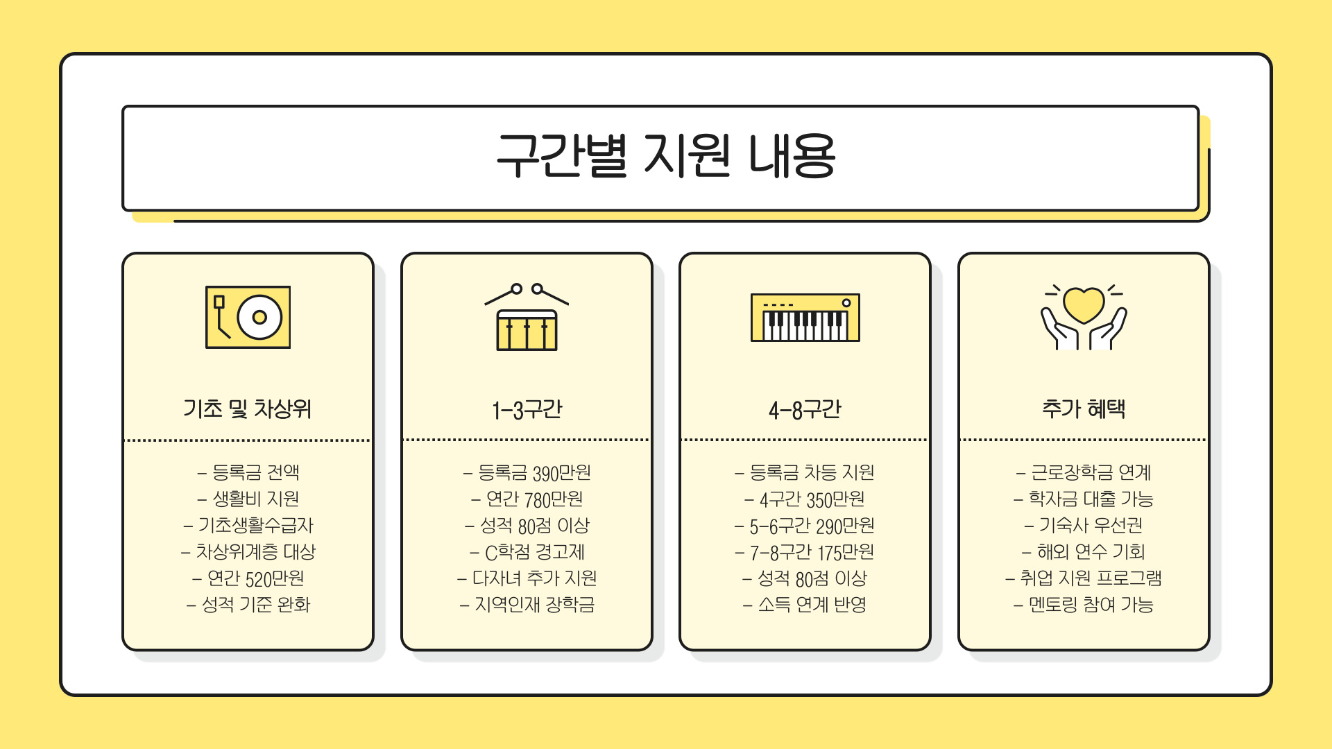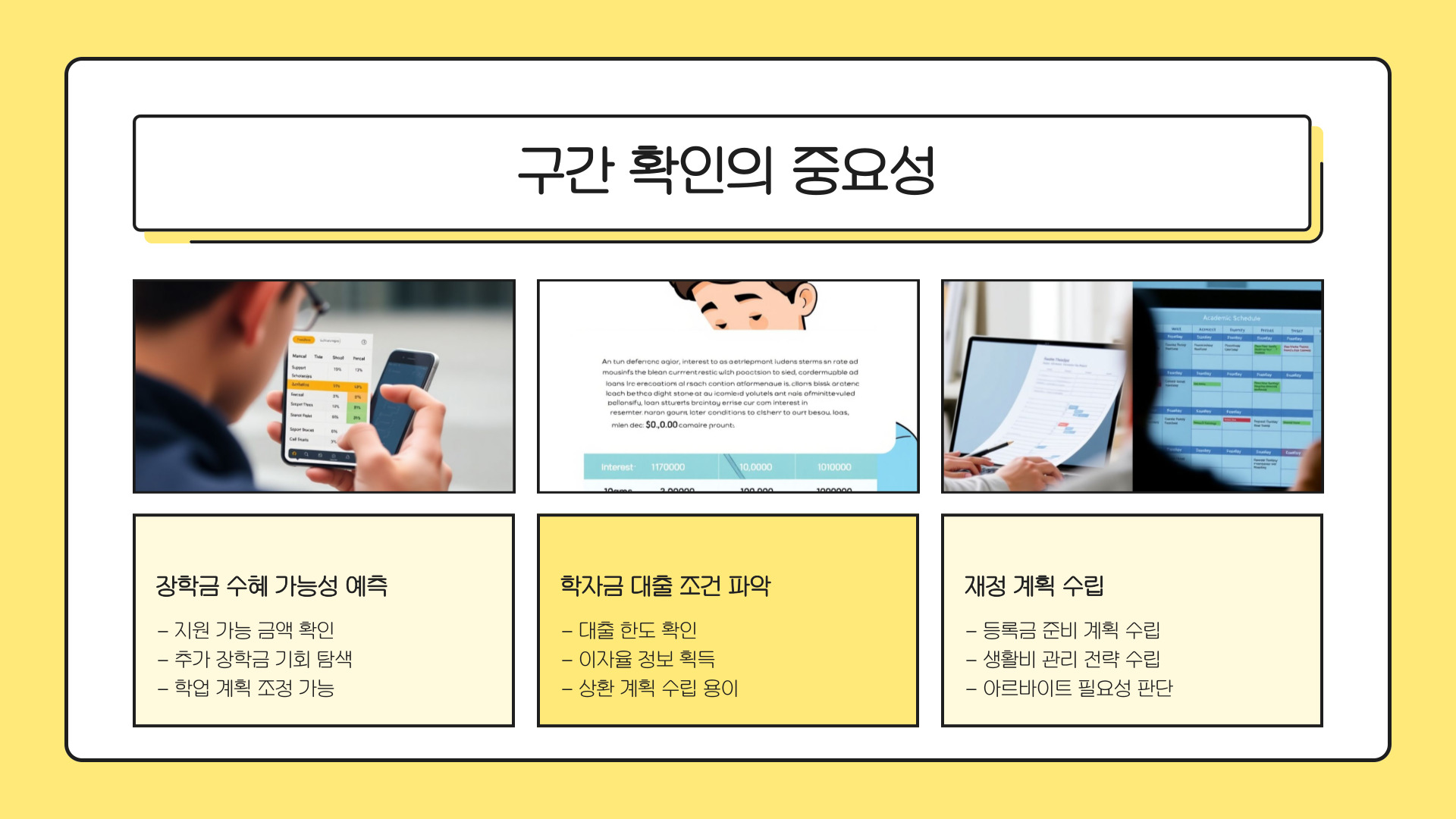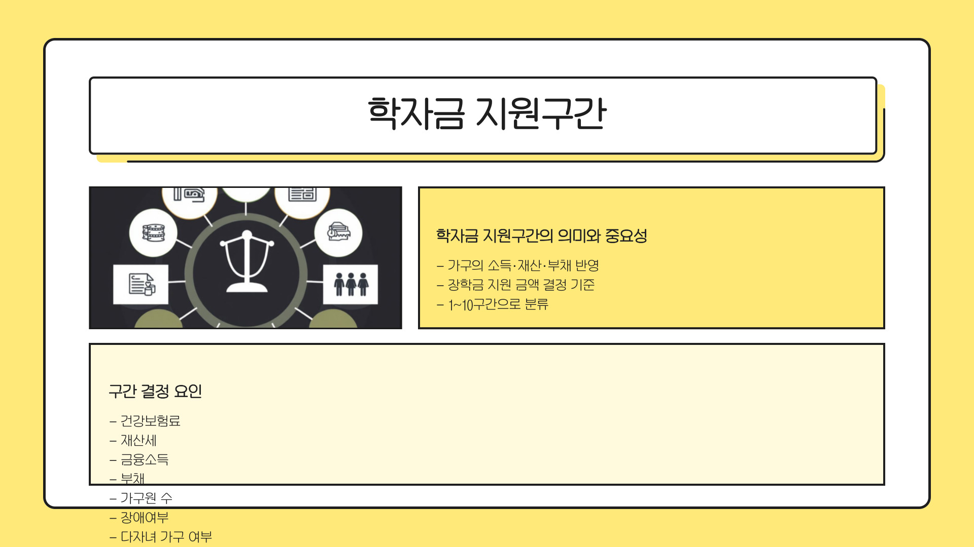 - 국가장학금은 경제적 지원 프로그램이며, 구간 확인이 중요하다.