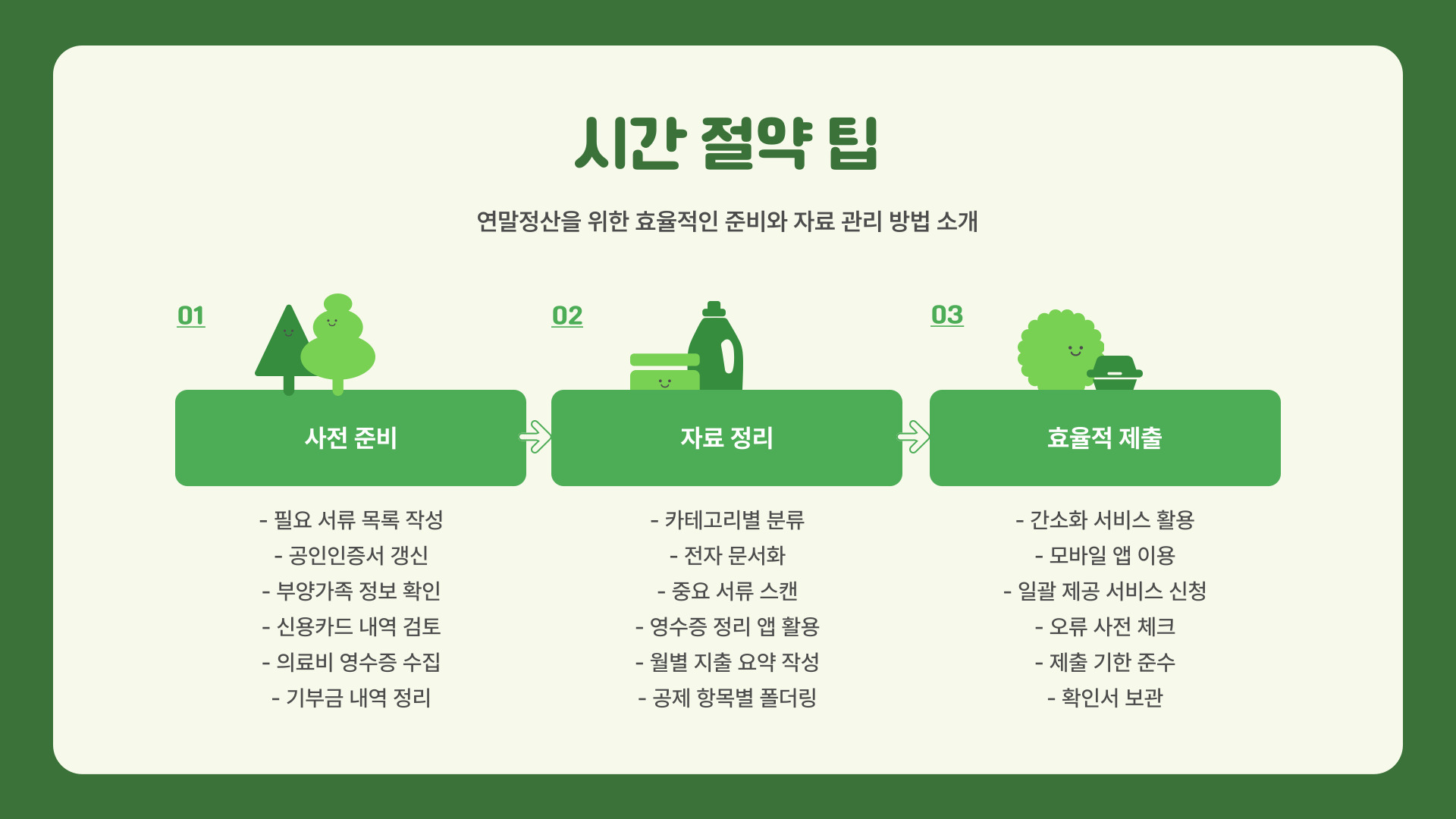 국세청의 연말정산 간소화 서비스를 최대한 효율적으로 활용하기 위해서는 몇 가지 팁을 기억하면 좋습니다. 첫째, 미리 필요한 서류와 정보를 준비하는 것입니다. 각종 공제 항목에 필요한 자료들을 미리 정리해 놓으면, 추가로 요구되는 자료가 있을 때 더 빠르게 대처할 수 있습니다.