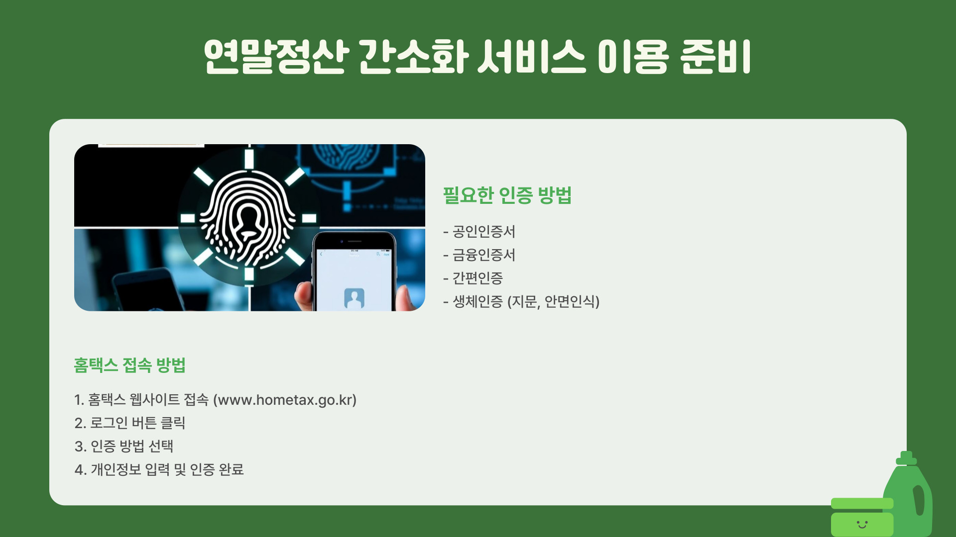 국세청 연말정산 간소화 서비스를 이용하기 위해서는 먼저 홈택스에 접속하여 로그인을 해야 합니다. 로그인 방법은 공동인증서나 금융인증서를 사용해야 합니다. 이때 일반적인 아이디 로그인은 지원되지 않으므로 주의가 필요합니다.