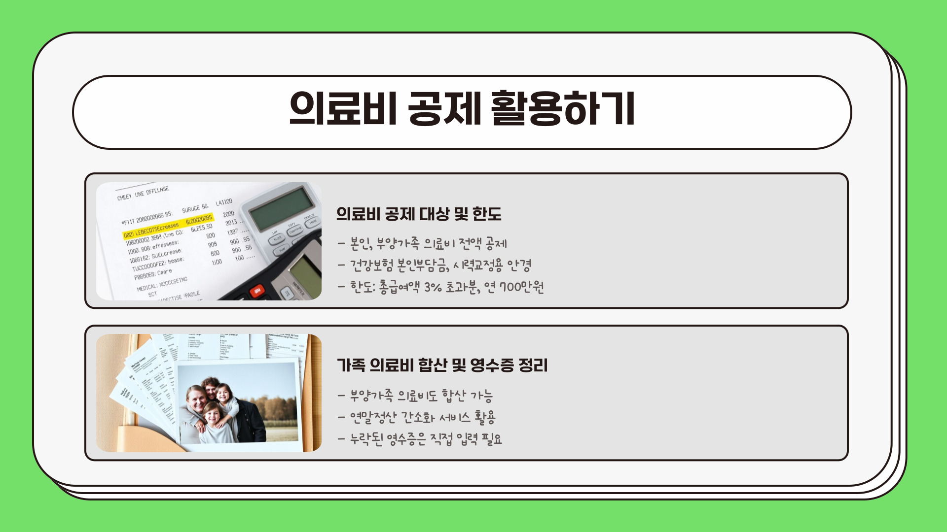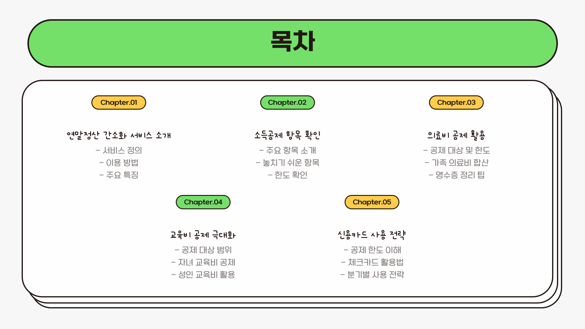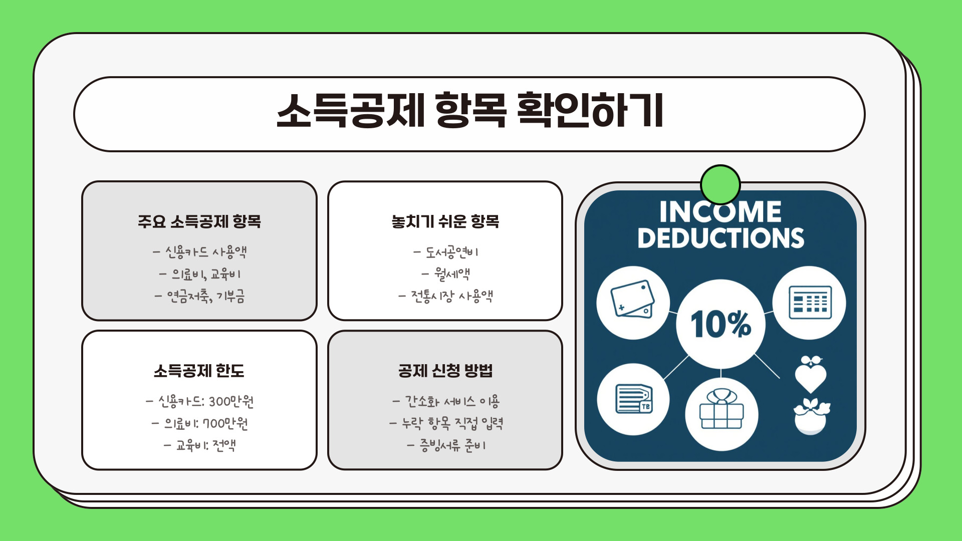 연말정산에서 가장 중요한 것은 소득공제 항목입니다. 소득공제를 제대로 이해하고 활용하면 세금 부담을 크게 줄일 수 있습니다. 예를 들어, 의료비, 교육비, 기부금 등 다양한 소득공제 항목이 있습니다. 이 항목들은 각각의 조건을 충족해야 하므로 미리 준비하는 것이 중요합니다. 소득공제 항목을 체크리스트 형식으로 정리하면 더욱 유용합니다.