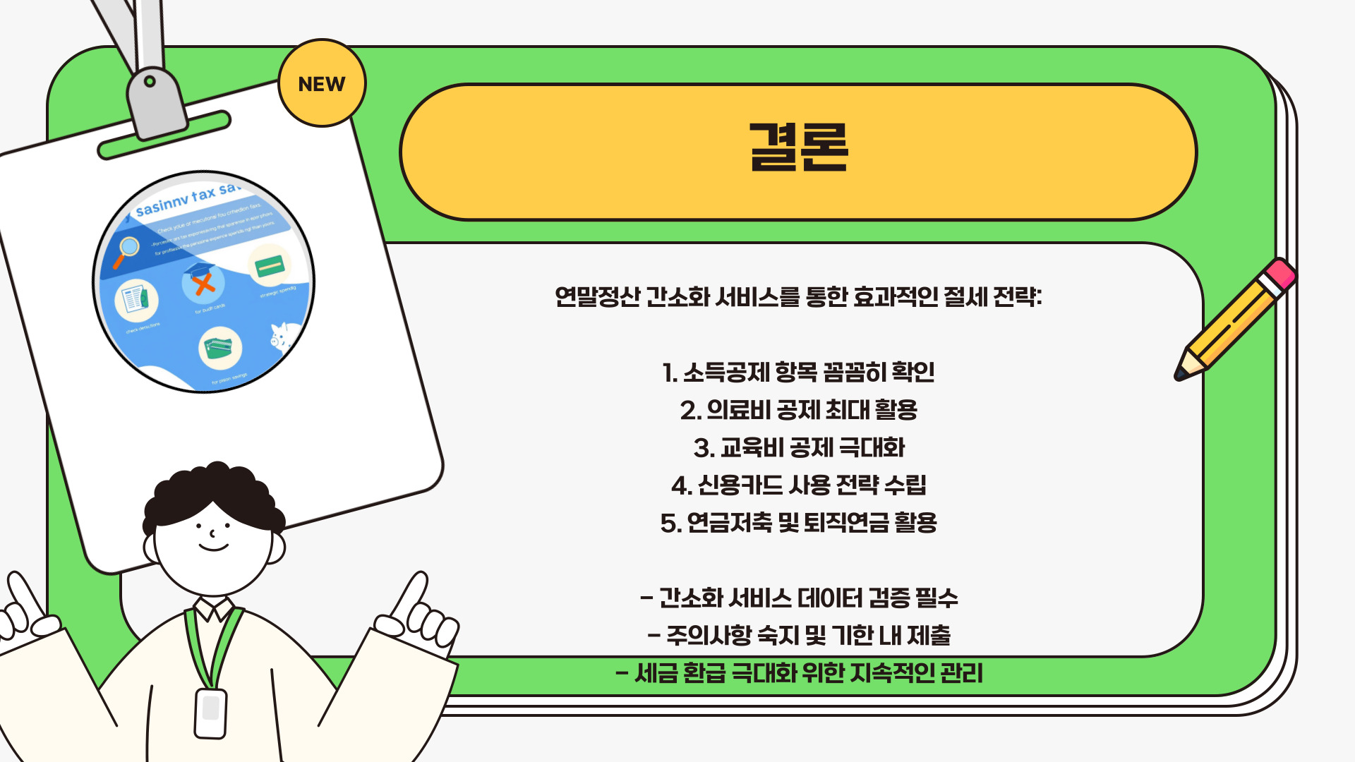 이처럼 국세청의 연말정산 간소화 서비스를 활용하면 세금을 절약할 수 있는 다양한 방법이 있습니다. 각 항목을 철저히 준비하고 관리하면 세금 환급액을 극대화 할 수 있습니다. 매년 정기적으로 정보를 업데이트하고, 필요한 서류를 사전에 준비하는 것이 중요합니다.