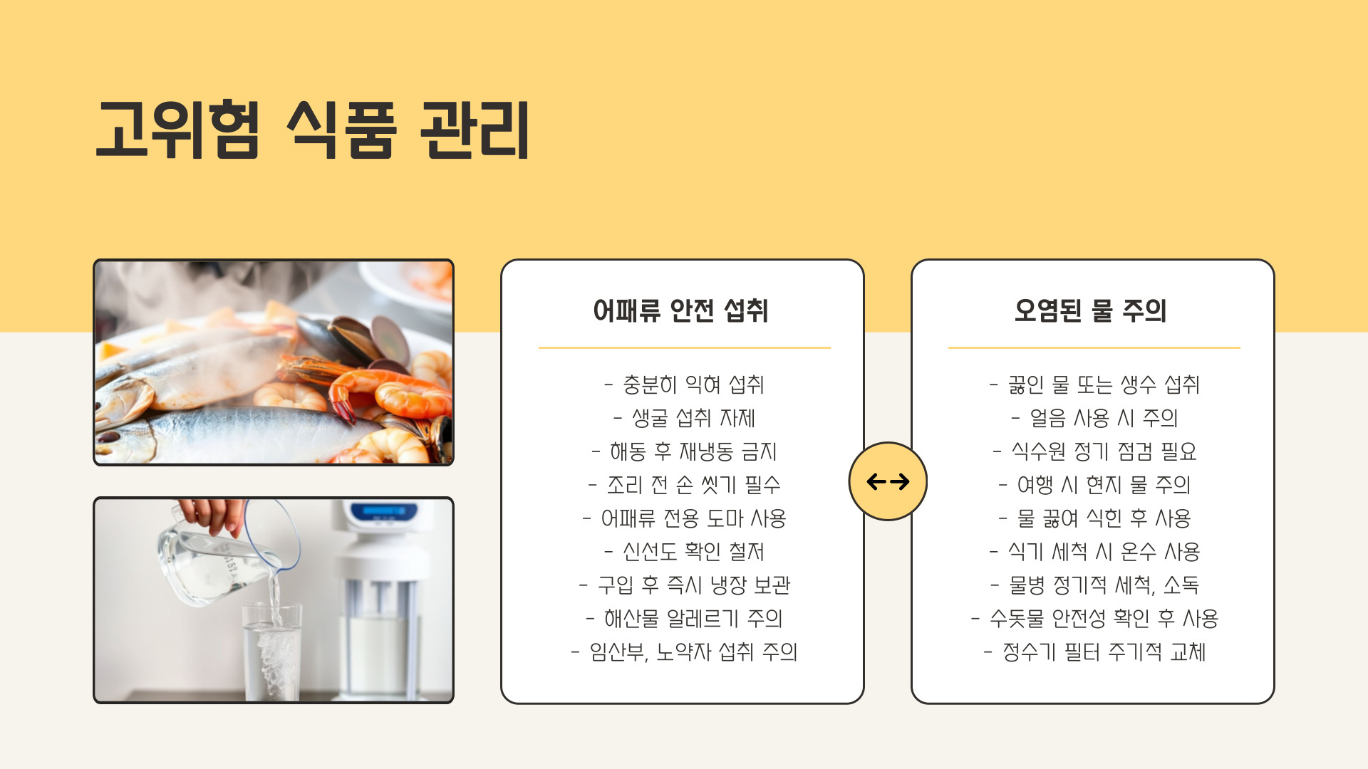 - 노로바이러스 감염 예방을 위해서는 가열되지 않은 해산물 섭취를 피해야 합니다.