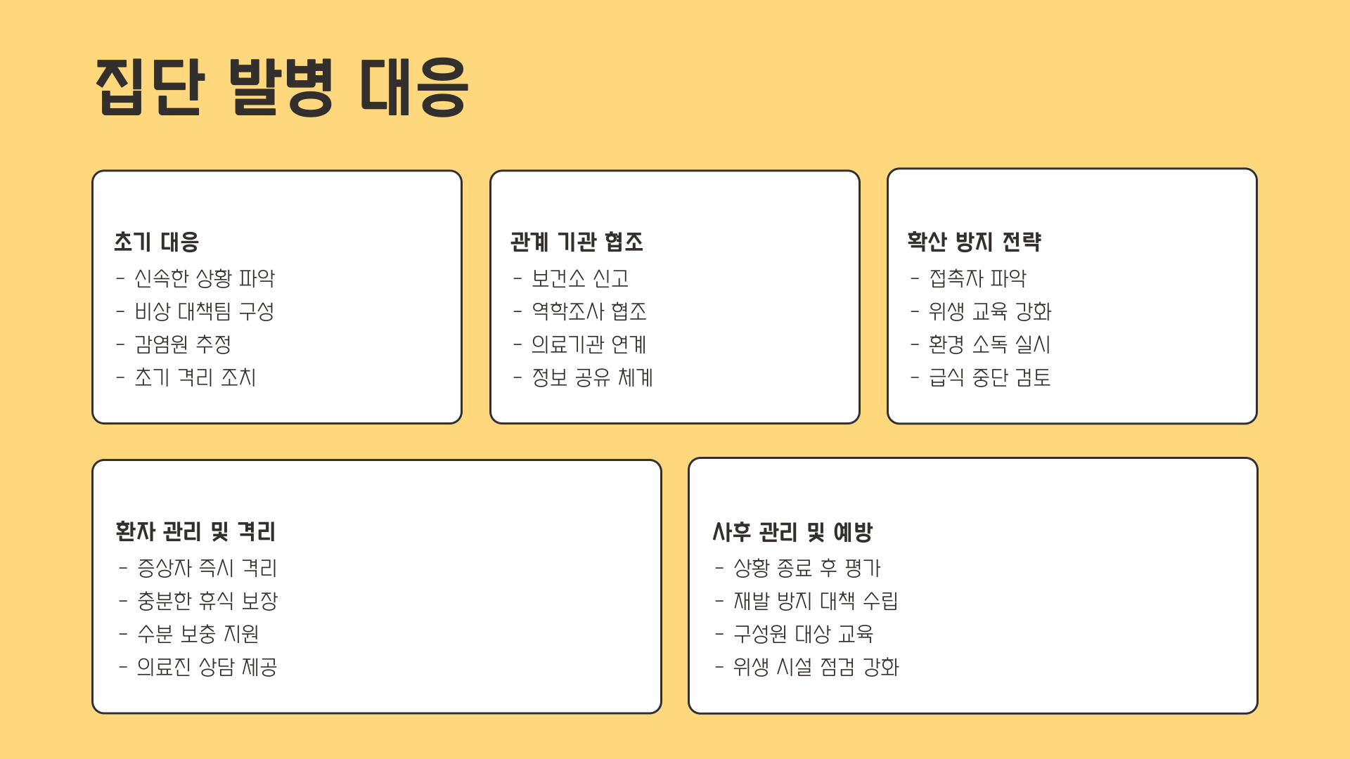 셋째, 감염이 의심되는 사람이 있는 경우, 음식 조리에 참여하지 않도록 해야 하며, 이러한 경우 구역을 철저히 소독하는 것이 중요합니다. 또 물은 가능하면 끓여서 마시는 것이 좋습니다. 정수도기나 지하수 사용 시 정기적으로 수질 검사를 통해 오염여부를 확인하는 것이 필요합니다.