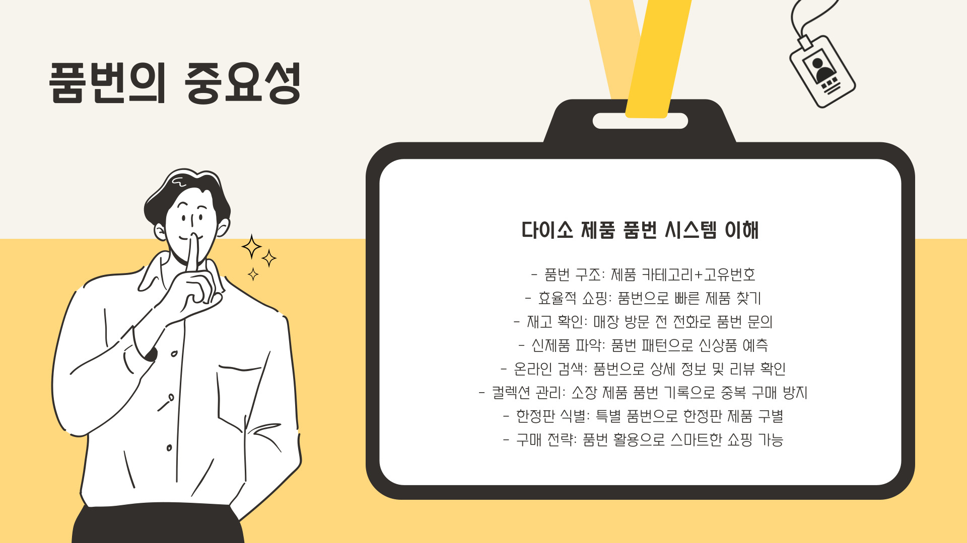 다이소의 딘토 품번은 각 제품의 정보를 포함하고 있습니다. 품번은 제품의 종류, 색상, 사이즈 등 다양한 정보를 담고 있어 소비자들이 원하는 제품을 쉽게 찾을 수 있도록 도와줍니다. 예를 들어, 특정 품번을 검색하면 해당 제품이 어떤 용도로 사용되는지, 어떤 재질로 만들어졌는지를 빠르게 알 수 있습니다.