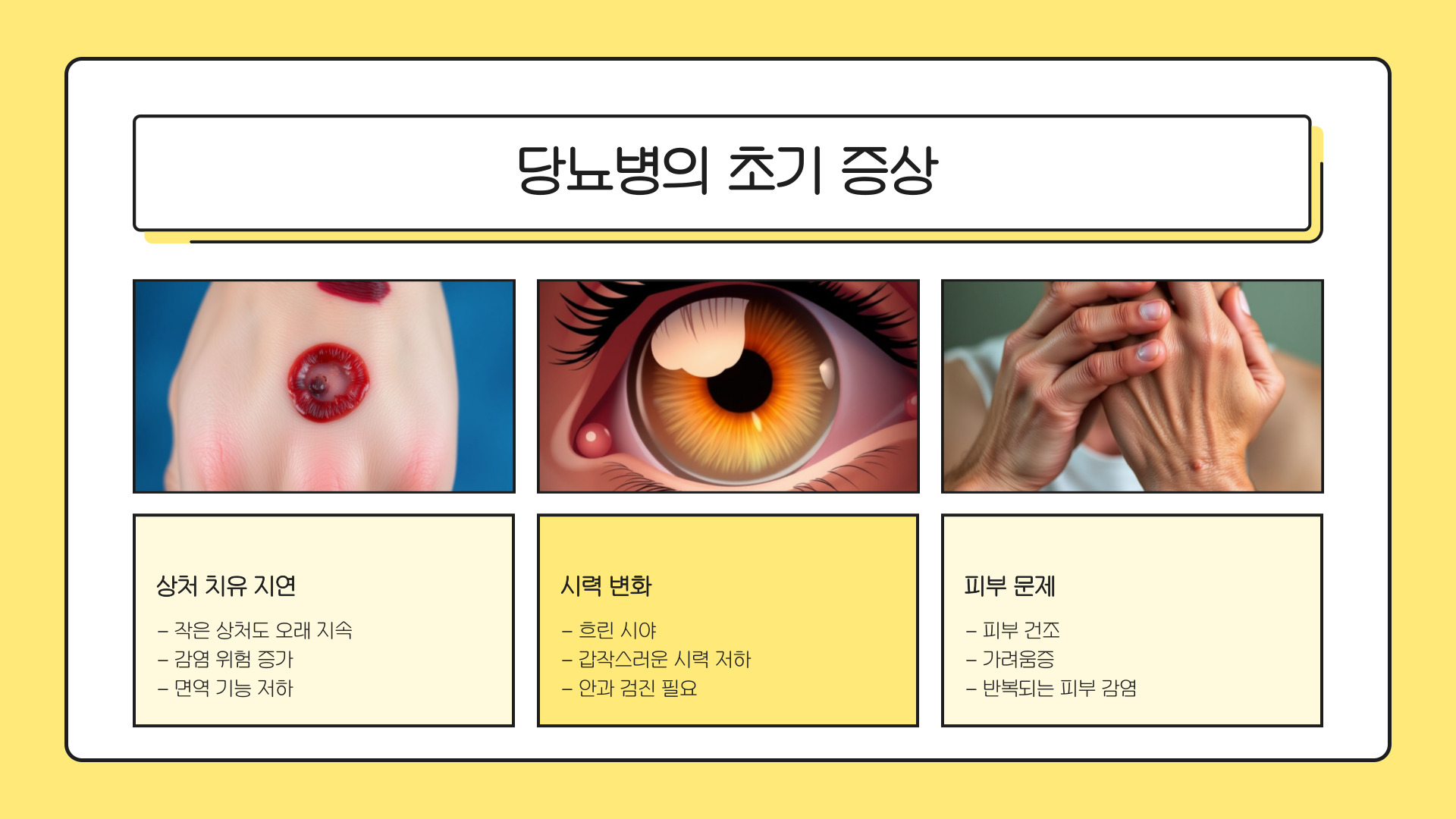당뇨의 초기증상은 다양합니다. 대표적인 증상으로는 잦은 소변, 과도한 갈증, 체중 감소 등이 있습니다. 특히, 빈번한 소변은 신체가 과도한 포도당을 배출하기 위해 수분을 더 많이 사용하기 때문에 발생합니다. 초기에 이를 인지하지 못하면 혈당 수치가 지속적으로 상승하게 되어 합병증을 초래할 수 있습니다.