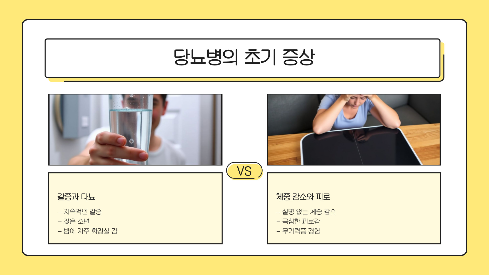 - 당뇨 초기증상에는 잦은 소변, 과도한 갈증, 체중 감소 등이 있다.