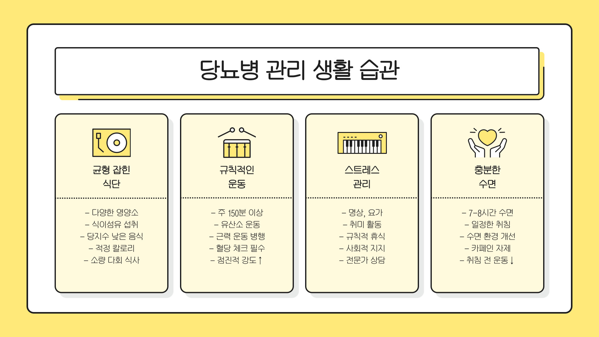 마지막으로, 스트레스 관리 또한 빼놓을 수 없는 요소입니다. 스트레스는 혈당 수치를 불안정하게 만들 수 있는 주요 요인 중 하나이며, 가능한 한 긍정적인 마인드를 유지하는 것이 중요합니다. 명상이나 심호흡 같은 간단한 방법으로 스트레스를 관리할 수 있습니다.