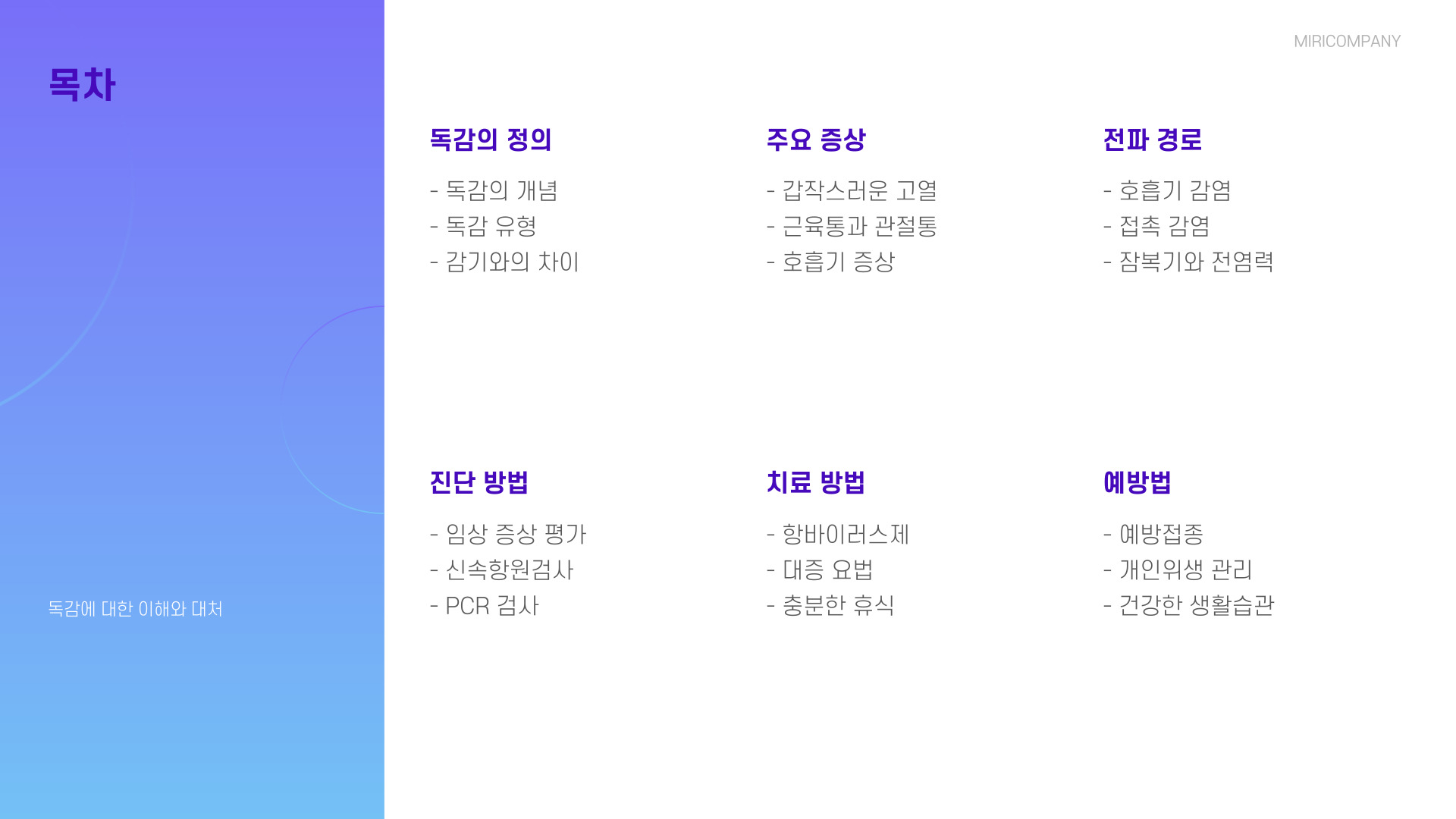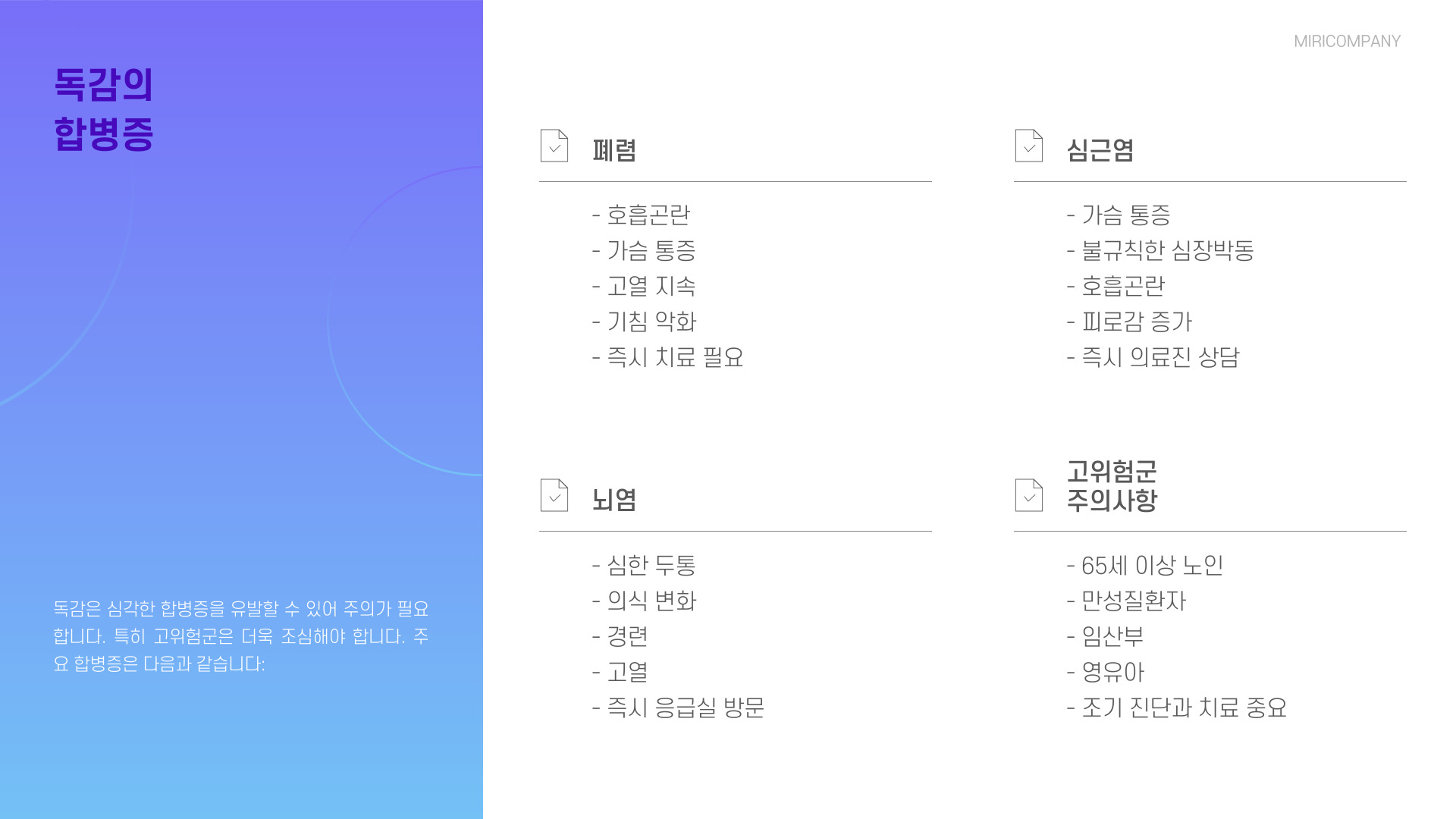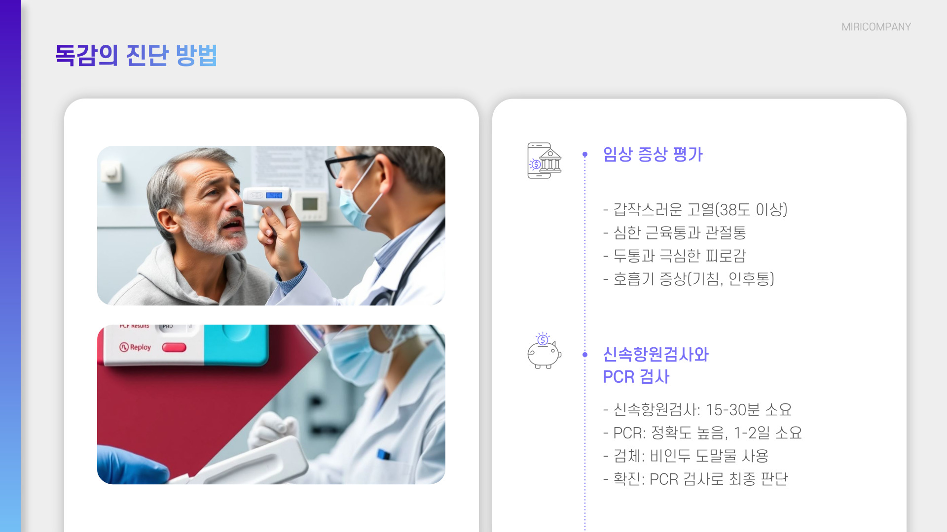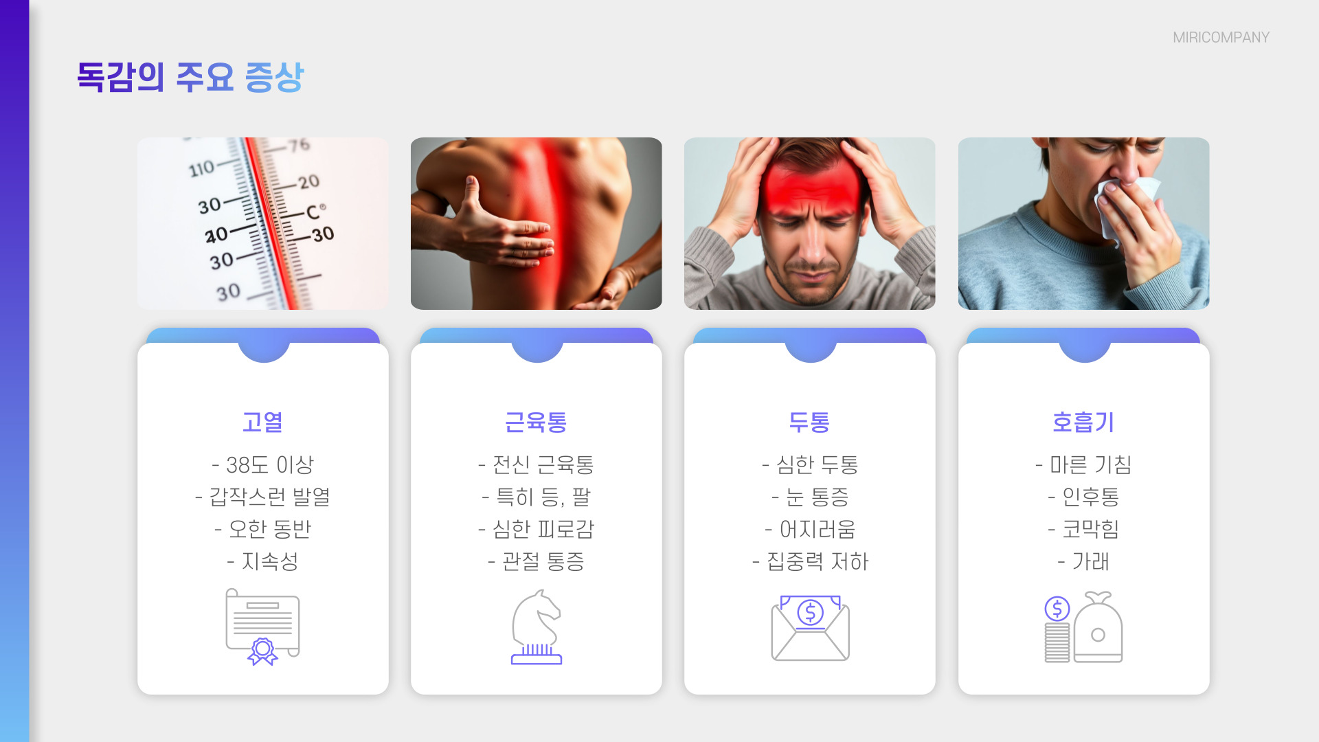 - 독감의 주요 증상: 고열, 기침, 인후통, 전신 피로감