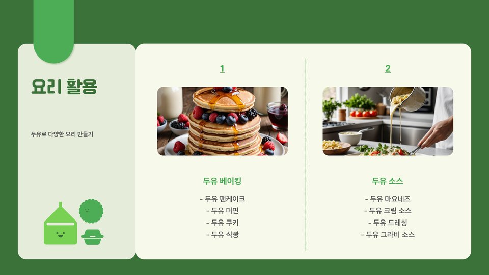 실제로, 간단한 레시피로는 재료로 준비된 소금, 바닐라 추출물, 또는 아몬드와 같은 견과류를 추가하여 개인의 기호에 맞게 두유의 맛을 조정할 수 있습니다. 이렇게 맛을 조정함으로써 이를 활용한 요리도 더욱 풍부해집니다. 예를 들어, 두유를 베이스로 한 스무디 또는 차가운 음료를 제작할 수 있습니다.