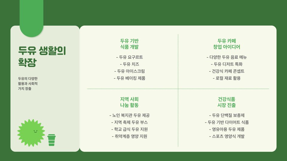 완성된 두유는 여러 방법으로 즐길 수 있습니다. 아침 식사로 시리얼과 함께 먹거나, 스무디에 추가하여 영양을 보충하는 방법도 좋습니다. 또한, 두유는 단백질과 식이섬유가 풍부하여 다이어트에도 효과적입니다. 게다가, 두유는 유당이 없기 때문에 유당 불내증이 있는 분들도 안심하고 섭취할 수 있습니다. 다양한 요리에 활용 가능한 두유는 건강한 라이프스타일을 위한 훌륭한 선택입니다.
