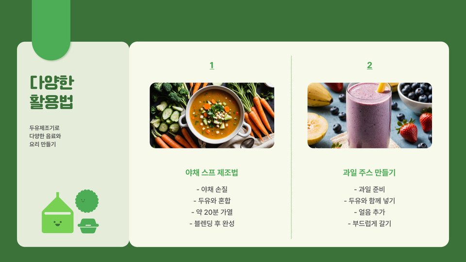 두유 만드는 기계는 기본적으로 단순하지만, 활용법에 따라 다양한 변화를 줄 수 있습니다. 예를 들어, 기본적인 두유 외에도 연유를 추가하거나 다른 식물성 재료를 믹스하면 다양한 맛을 즐길 수 있습니다. 이러한 변형을 통해 더욱 다채로운 식사를 즐길 수 있습니다.
