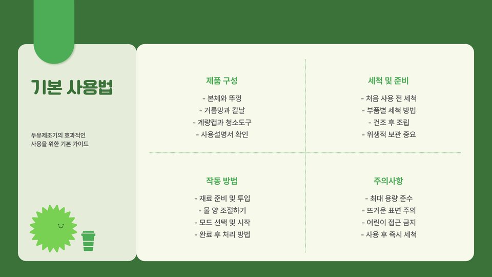 작동 원리는 간단합니다. 먼저, 적절한 양의 콩을 물에 불리고, 두유 만드는 기계에 넣습니다. 이후 기계의 버튼을 눌러 작동시키면, 기계 내부의 블레이드가 콩과 물을 갈기 시작하며, 열을 가하여 두유의 맛과 영양을 살립니다. 이렇게 만들어진 두유는 여러 가지 방법으로 활용될 수 있습니다.