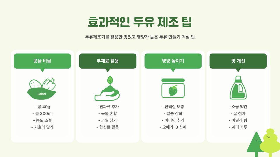 두유 만드는 기계를 최대한 활용하기 위해서는 몇 가지 팁이 중요합니다. 먼저, 콩을 물에 적절한 시간 동안 불려주는 것이 핵심입니다. 콩이 충분히 불어야 부드러운 두유가 만들어지며, 이는 맛과 질감에 큰 영향을 미칩니다. 일반적으로 6시간 이상 불리는 것을 추천합니다.