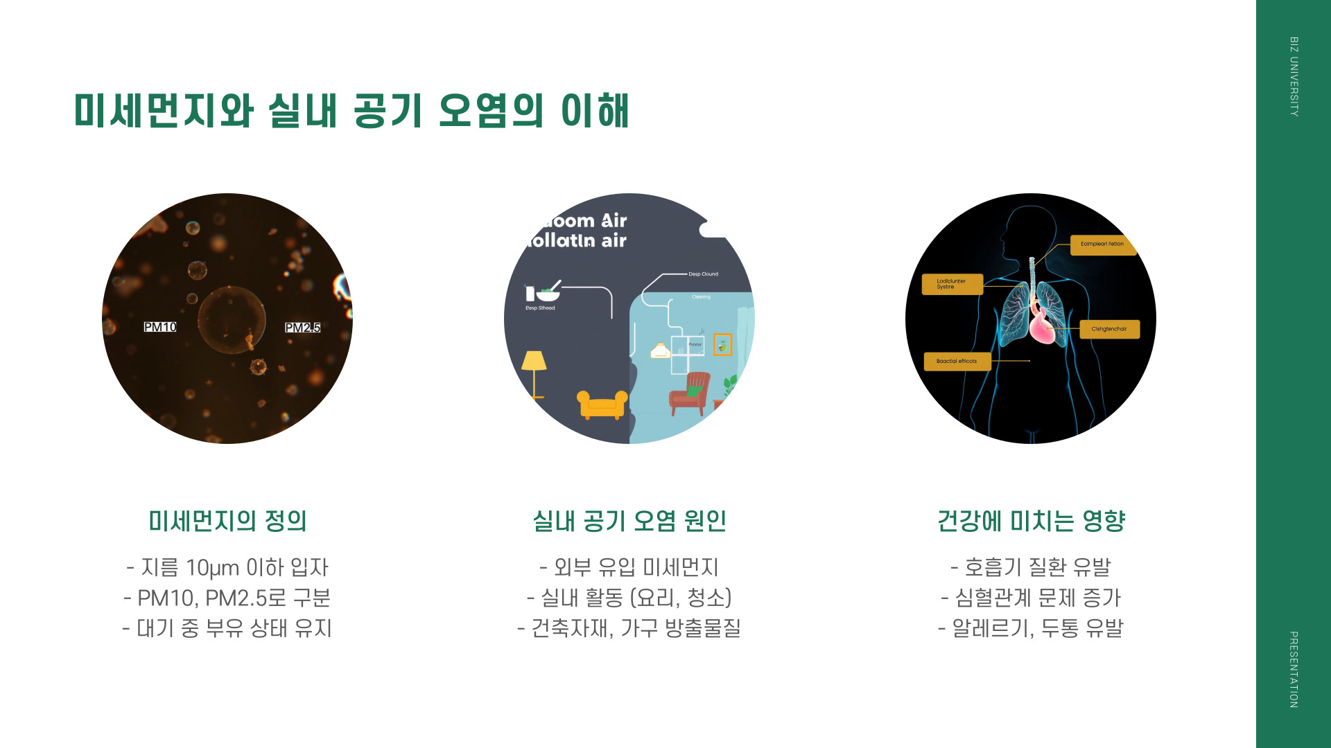 • 미세먼지란 지름 10㎛ 이하의 먼지 입자를 의미하며, 다양한 원인으로 건강에 위험을 초래할 수 있습니다.