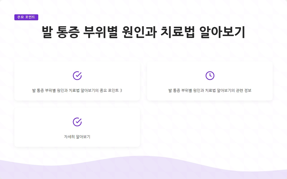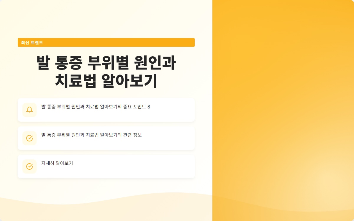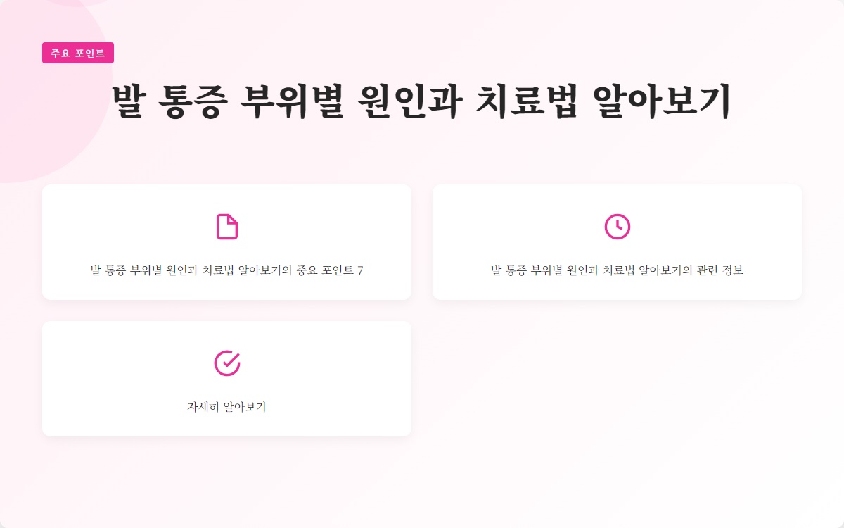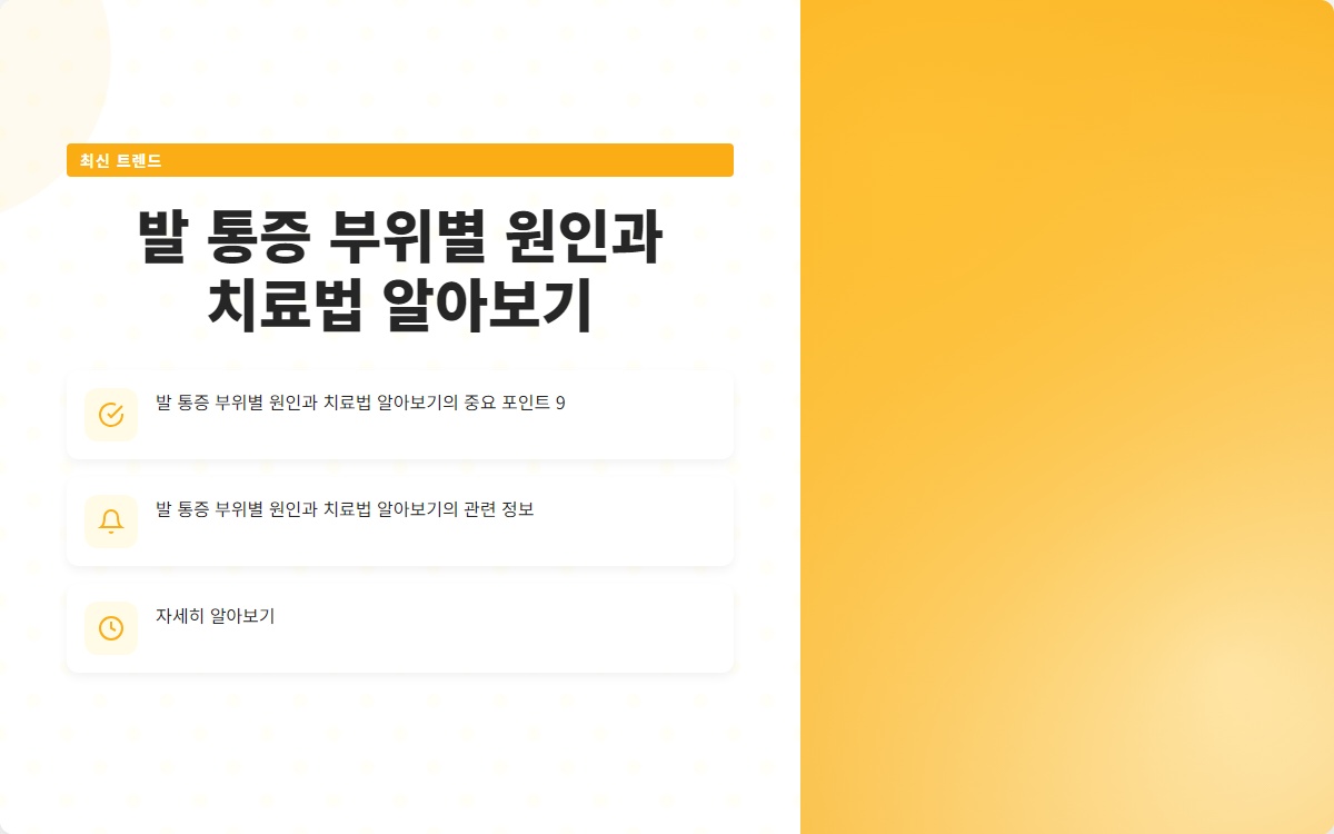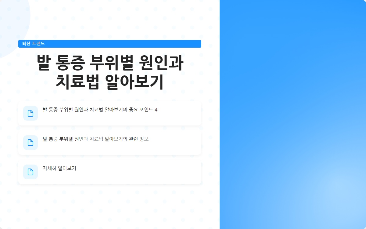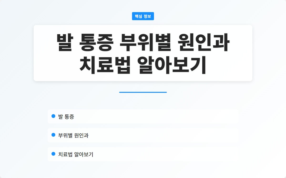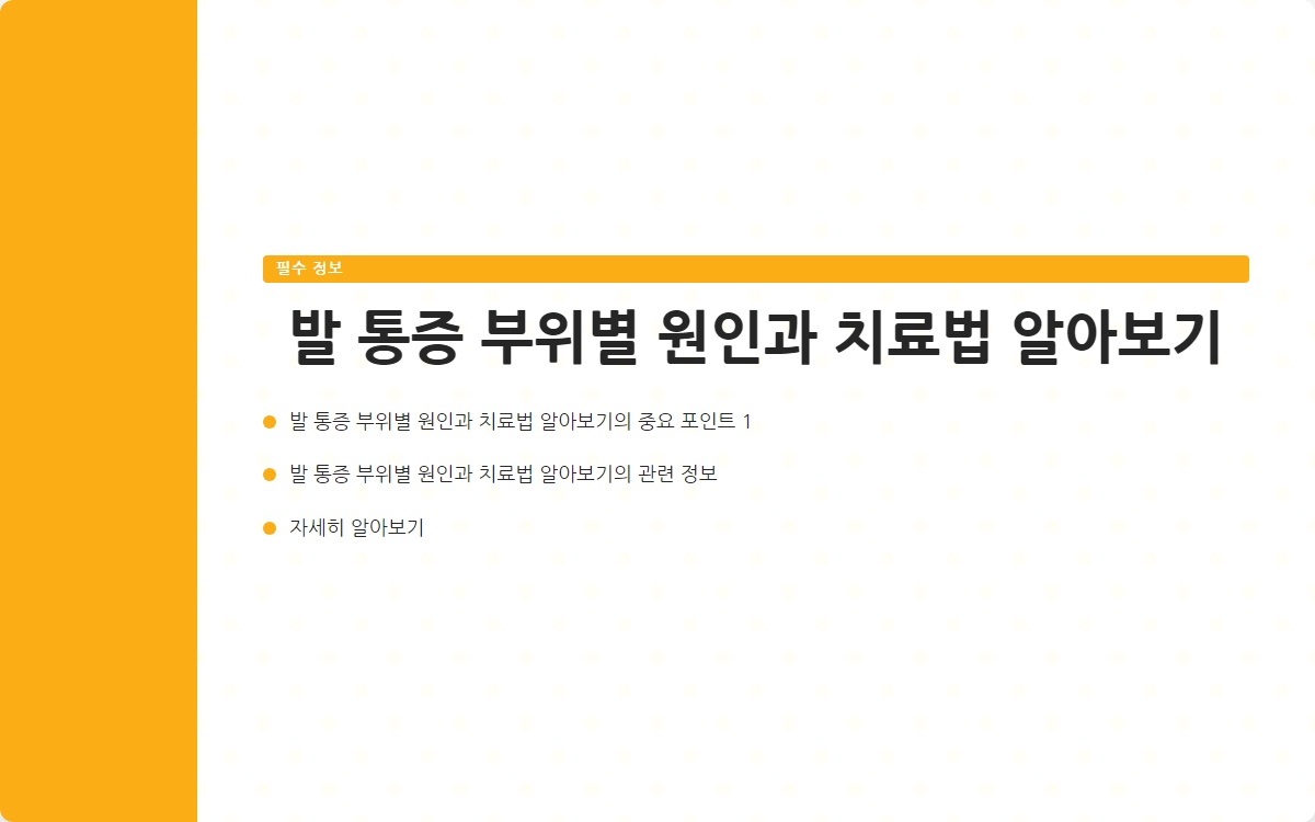 결론: 발 통증은 다양한 원인에 의해 발생하며, 각 부위에 따라 적절한 대처법이 필요합니다. 이 글을 통해 발 통증의 원인과 치료법을 이해하고, 건강한 발을 유지하는 데 도움이 되시길 바랍니다. 추가 정보를 원하시면 블로그 구독을 잊지 마세요!
