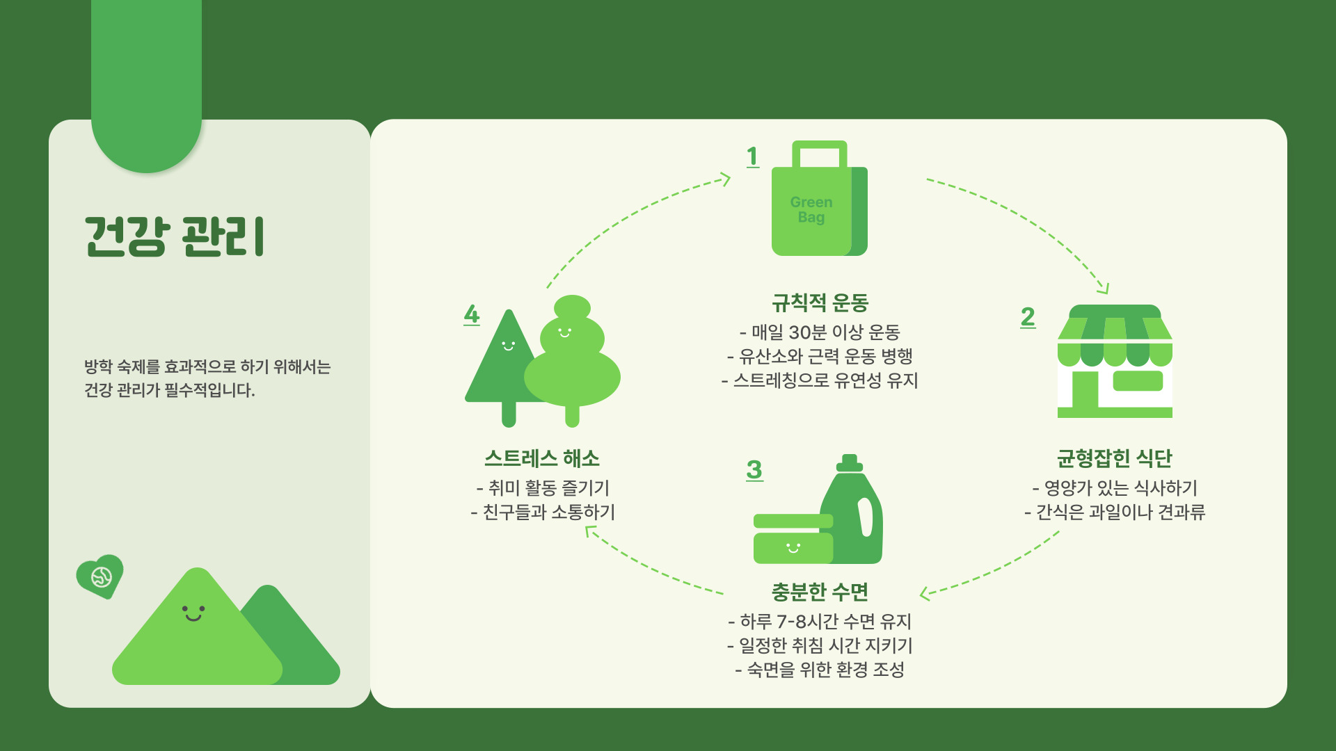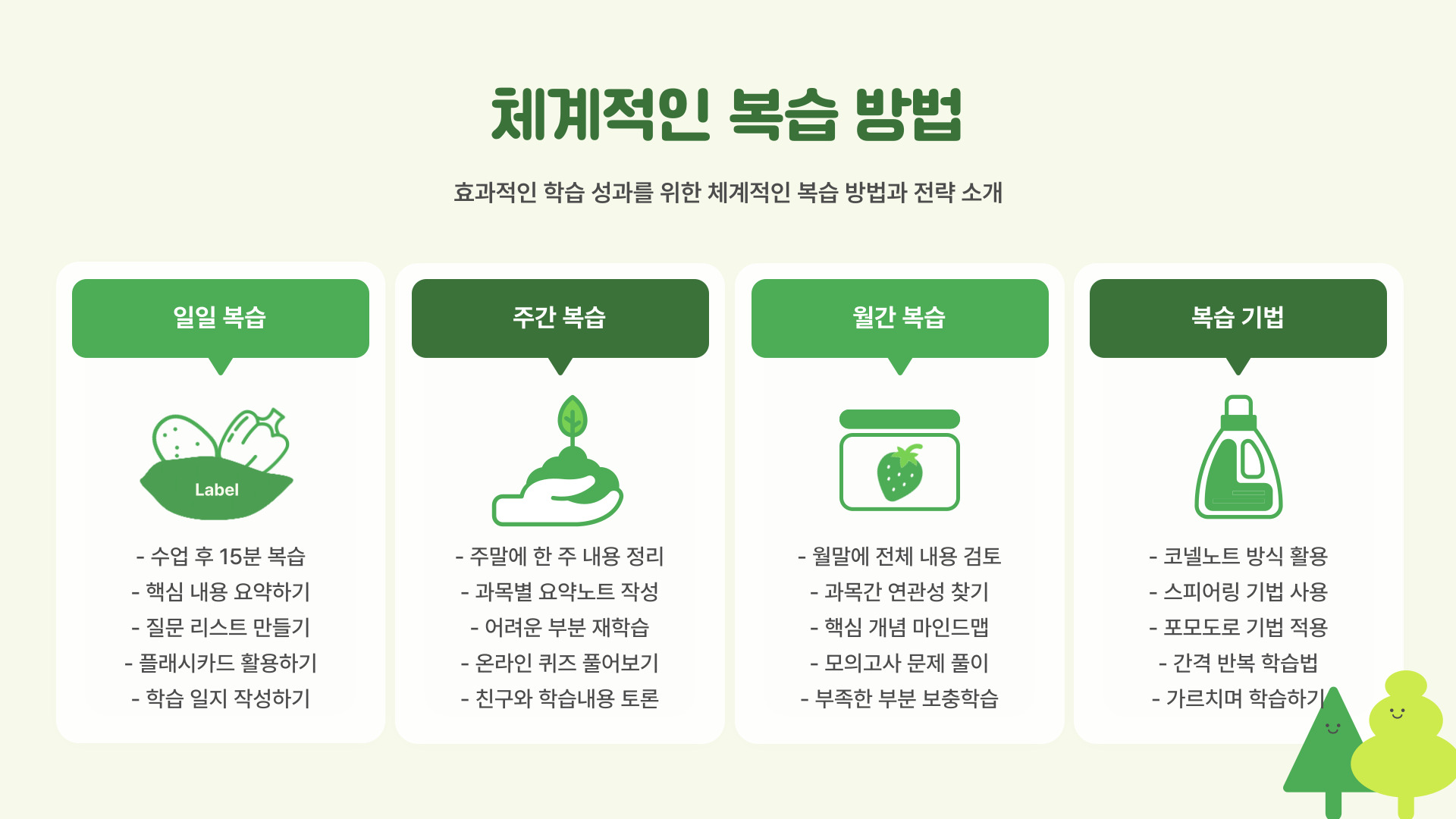 모든 숙제를 마친 후에는 반드시 복습을 하는 것이 중요합니다. 복습을 통해 자신의 이해도를 확인하고, 부족한 부분을 보완할 수 있습니다. 또한, 복습은 다음 학기 수업에 대한 준비에도 도움이 됩니다. 복습할 때는 친구와 함께 하거나, 가족에게 설명하는 방식으로 진행하면 더 효과적입니다. 이렇게 하면 재미있으면서도 유익한 시간 보낼 수 있습니다.