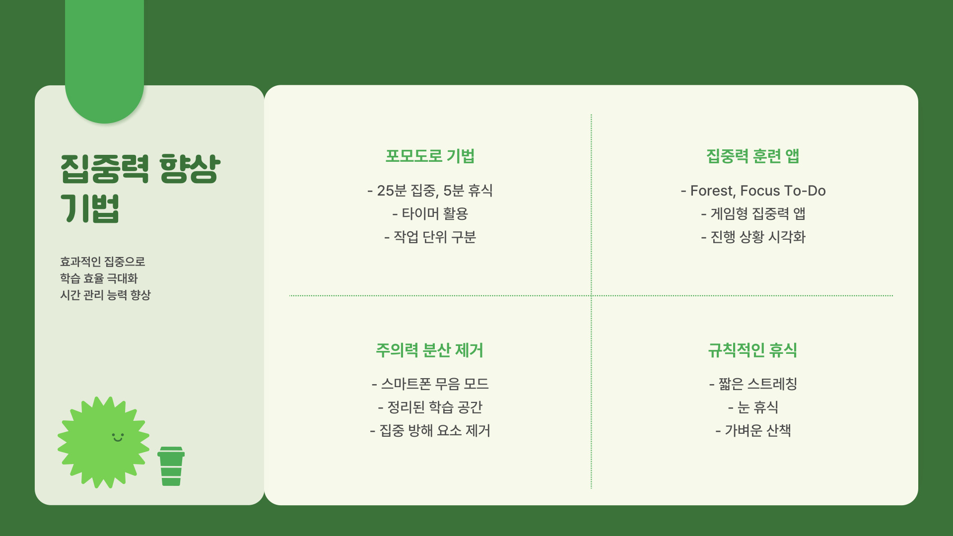 - 짧은 휴식을 포함시켜 집중력을 유지한다.