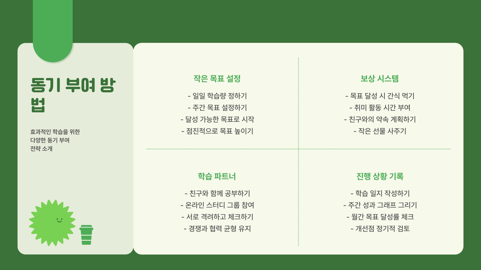 - 작은 성과를 통해 동기 부여