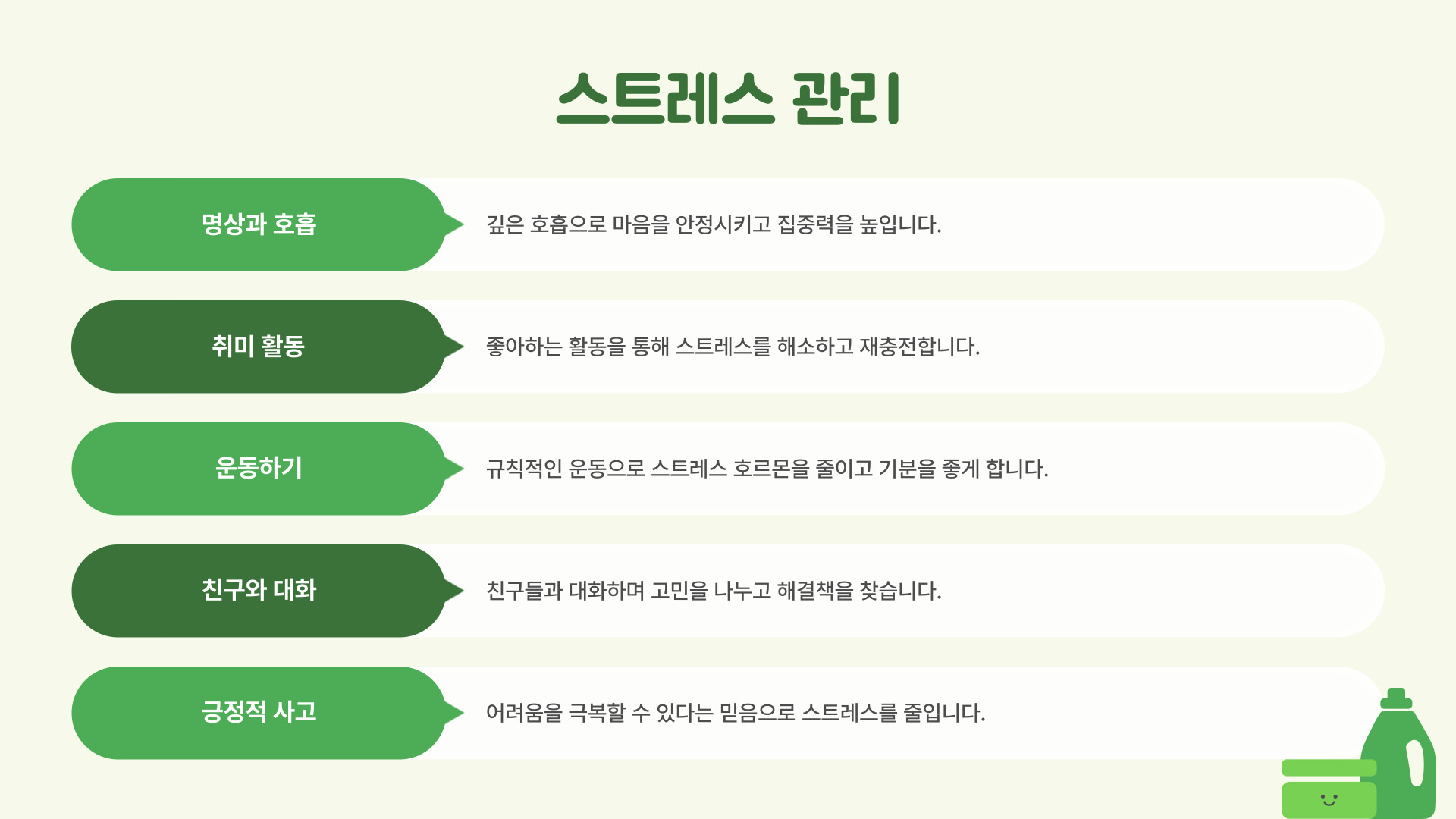 - 작업 공간을 정리하여 집중력을 높인다.