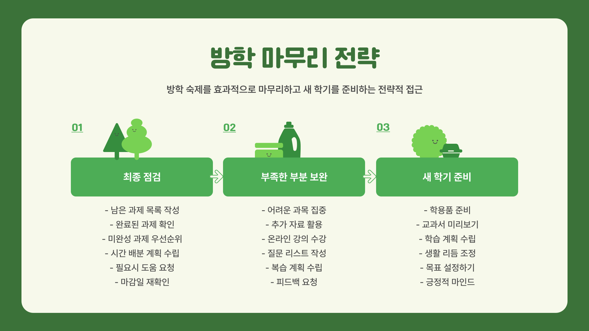 모든 숙제를 마친 후에는 반드시 복습을 하는 것이 중요합니다. 복습을 통해 자신의 이해도를 확인하고, 부족한 부분을 보완할 수 있습니다. 또한, 복습은 다음 학기 수업에 대한 준비에도 도움이 됩니다. 복습할 때는 친구와 함께 하거나, 가족에게 설명하는 방식으로 진행하면 더 효과적입니다. 이렇게 하면 재미있으면서도 유익한 시간 보낼 수 있습니다.