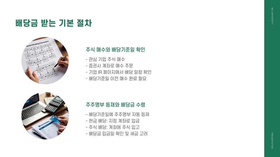 배당금을 받으려면 몇 가지 조건을 충족해야 합니다. 첫째, 배당금 지급을 결정하는 이사회 결의가 필요합니다. 회사는 배당금을 지급하기로 결정하면 이사회의 승인을 받아야 하며, 이는 주주들에게 발표됩니다.