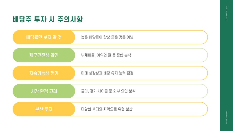 중요 팁: 배당금 수익률이 높더라도, 기업의 재무 건강이 나쁜 경우에는 위험할 수 있습니다. 따라서, 기업의 재무제표와 주가 추세를 함께 분석하는 것이 필요합니다.
