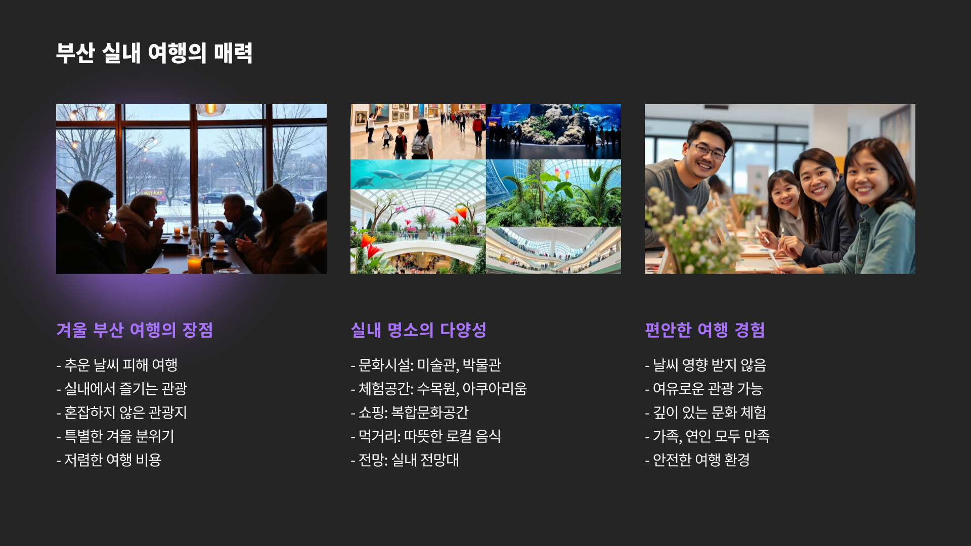 부산은 아름다운 해변과 다양한 관광지로 유명하지만, 겨울철에는 실내에서 즐길 수 있는 명소들이 더욱 매력을 발산합니다. 오늘은 부산 가볼만한곳 중에서도 겨울에 추천할 만한 실내 명소 TOP 10을 소개하겠습니다. 각 장소는 독특한 매력을 가지고 있으며, 가족, 친구, 연인과 함께 즐기기 좋은 곳입니다. 그럼 시작해볼까요?