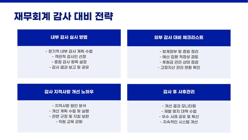 중요 팁: 내부 감사는 정기적으로, 그리고 불시에 실시되어야 합니다. 이를 통해 회계 처리의 투명성을 높이고, 실수나 법적 문제를 사전에 예방할 수 있습니다.
