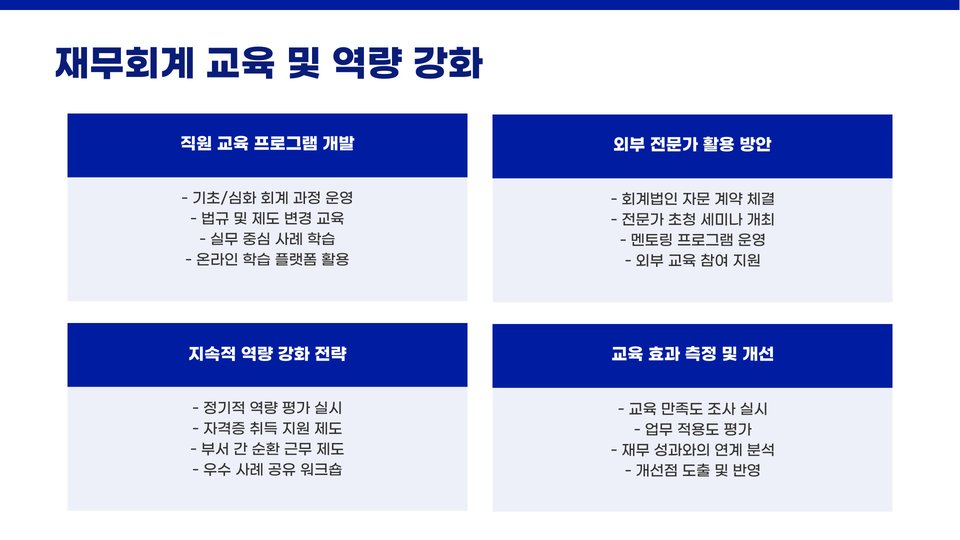 또한, 직원 교육이 필수적입니다. 모든 직원이 사용하는 시스템에 대한 충분한 교육을 받는 것이 중요합니다. 이렇게 하면 시스템을 최대한 활용하고, 데이터 입력 및 보고의 정확성을 높일 수 있습니다. 예를 들어, 매월 정기적인 교육 세션을 운영하여 직원들의 회계 지식을 끊임없이 업데이트할 수 있습니다.