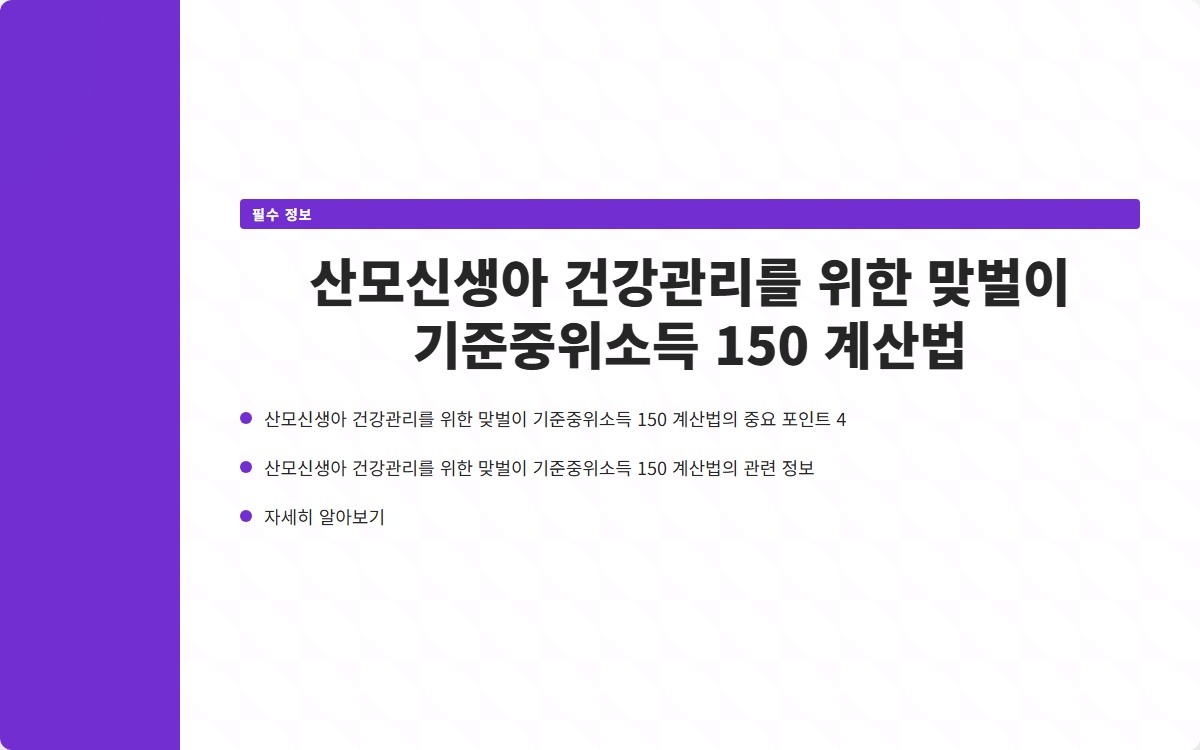 출산 후 산모와 신생아의 건강관리는 매우 중요합니다. 그러나 맞벌이를 하는 가정에서는 경제적 여건도 고려해야 합니다. 특히 기준중위소득 150%을 기준으로 하여 지원 혜택을 받을 수 있는 조건을 이해하는 것이 필수적입니다. 이 글에서는 기준중위소득 150%의 개념과 이를 계산하는 방법을 자세히 알아보겠습니다.