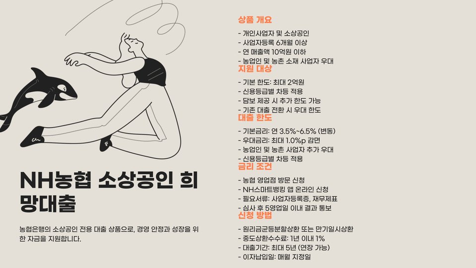 농협에서 제공하는 소상공인 대출은 농업 관련 사업자뿐만 아니라 일반 소상공인도 이용할 수 있는 상품입니다. 특히, 지역 농협의 지원으로 친근하게 대출 상담이 가능하며, 대출 한도와 조건이 유연한 편입니다. 사업자 등록증과 기본 서류만으로 간편하게 신청할 수 있습니다.