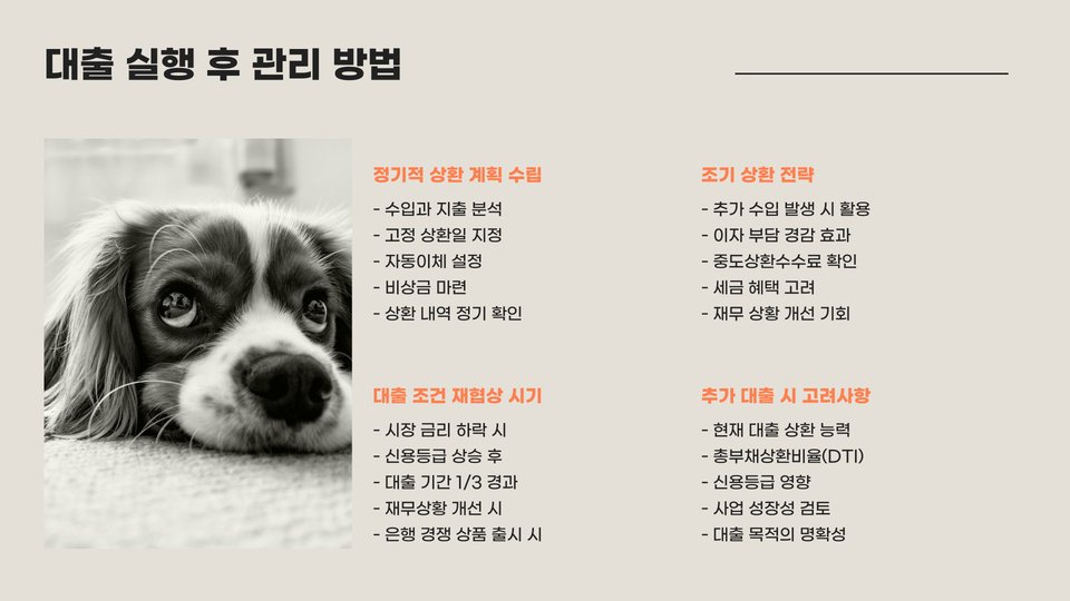 - 이자율은 금융기관에 따라 상이하므로 사전 조사가 필요.
