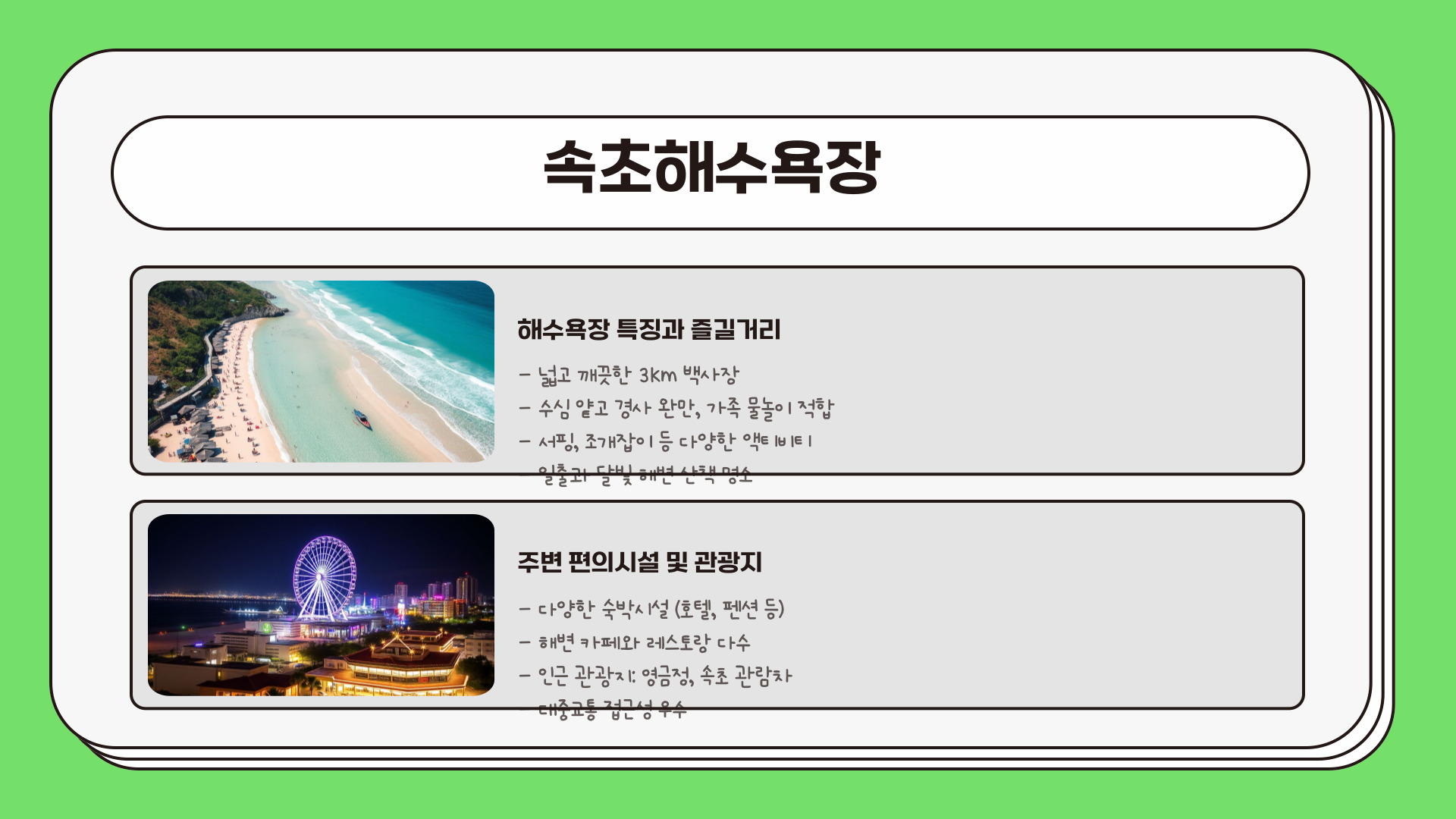 속초는 그 자체로 매력적인 여행지이지만, 조금 더 깊이 있는 경험을 통해 더욱 즐거운 여행이 될 수 있습니다. 맛집 탐방, 자연 액티비티, 문화 체험 등을 통해 속초의 진정한 매력을 발견해보세요. 이처럼 다양한 방법으로 속초를 즐긴다면, 잊지 못할 기억이 될 것입니다.