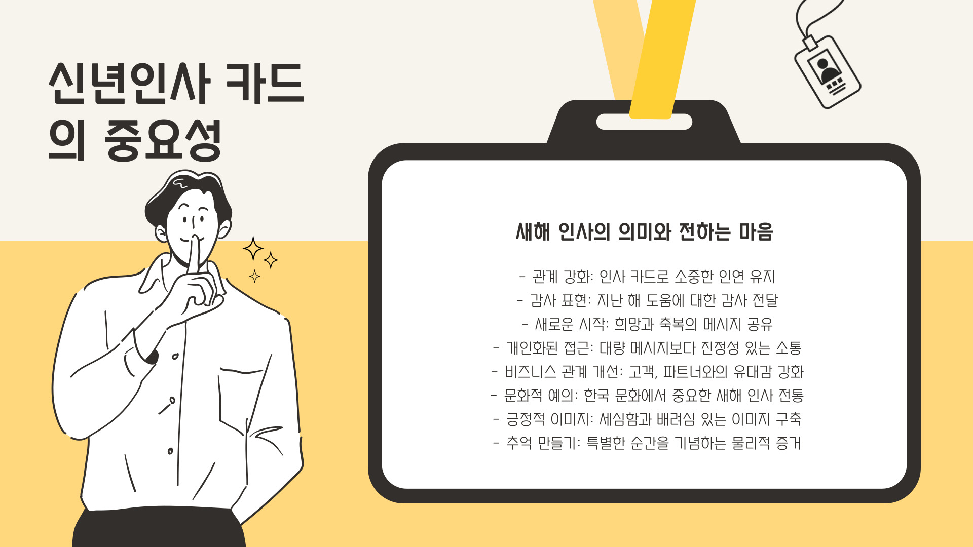 신년인사 카드는 단순한 명절 인사 이상의 의미를 지닙니다. 이 카드는 사랑과 감사의 마음을 전달하는 도구입니다. 소중한 사람들에게 새로운 한 해의 시작을 알리고, 그들의 행복을 기원하는 메시지를 전달하는 데 큰 역할을 합니다.