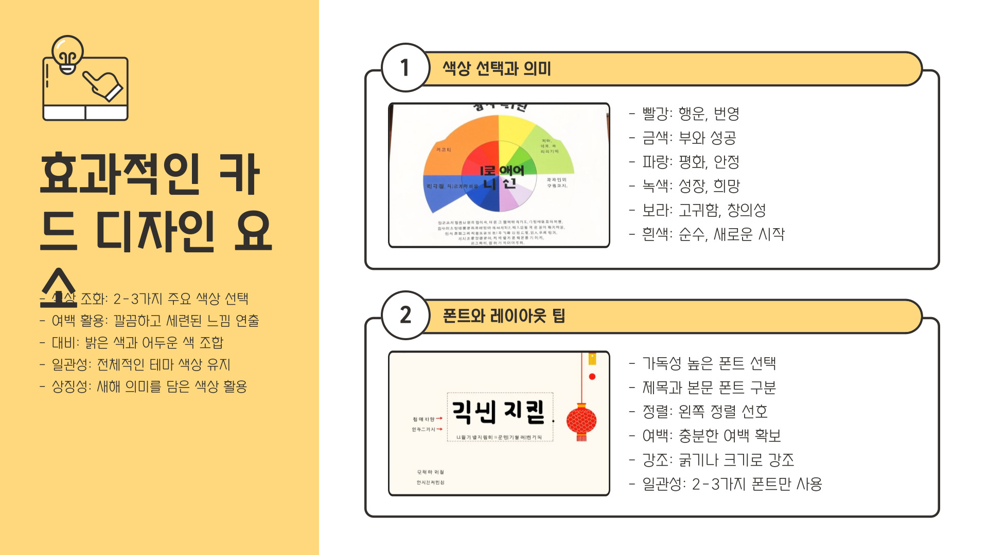 3. **메시지 작성**: 카드에 담을 메시지를 생각합니다. ‘새해 복 많이 받으세요!’와 같은 전통적인 인사말부터, 개인적인 소감이나 축하 메시지를 추가하는 것도 좋습니다.