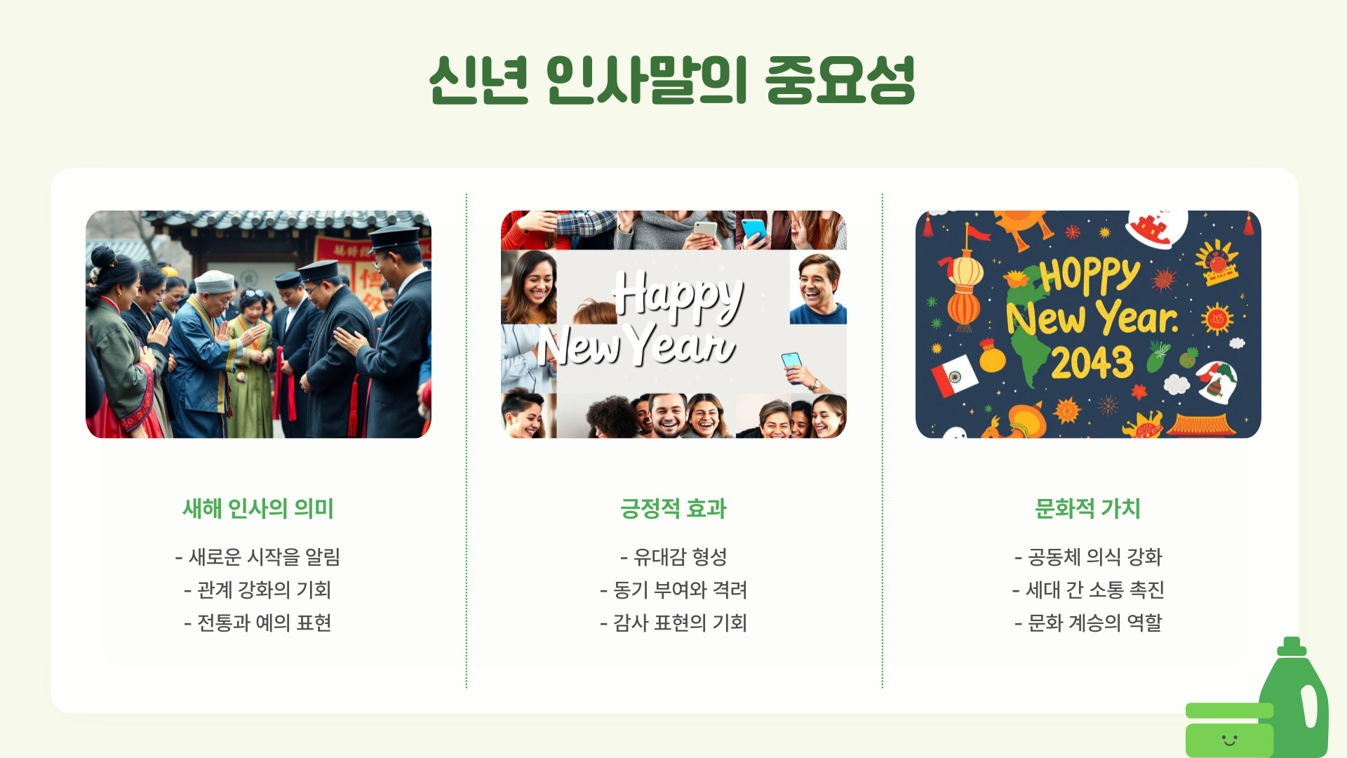 유명한 인사말 중 하나는 "올해에는 모든 소망이 이루어지기를 바랍니다"입니다. 이처럼 직접적인 메시지는 긍정적인 에너지를 불어넣어 주며, 많은 사람들에게 희망을 주는 인사말입니다.
